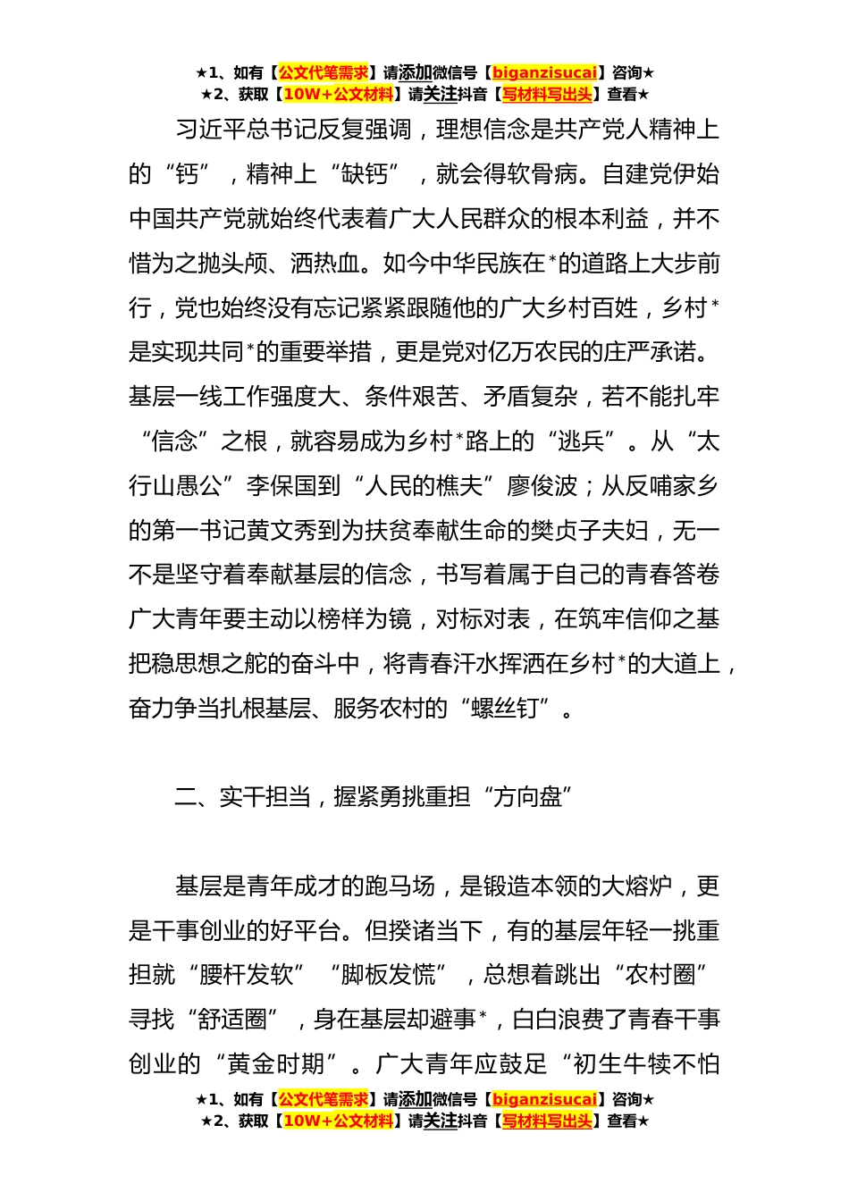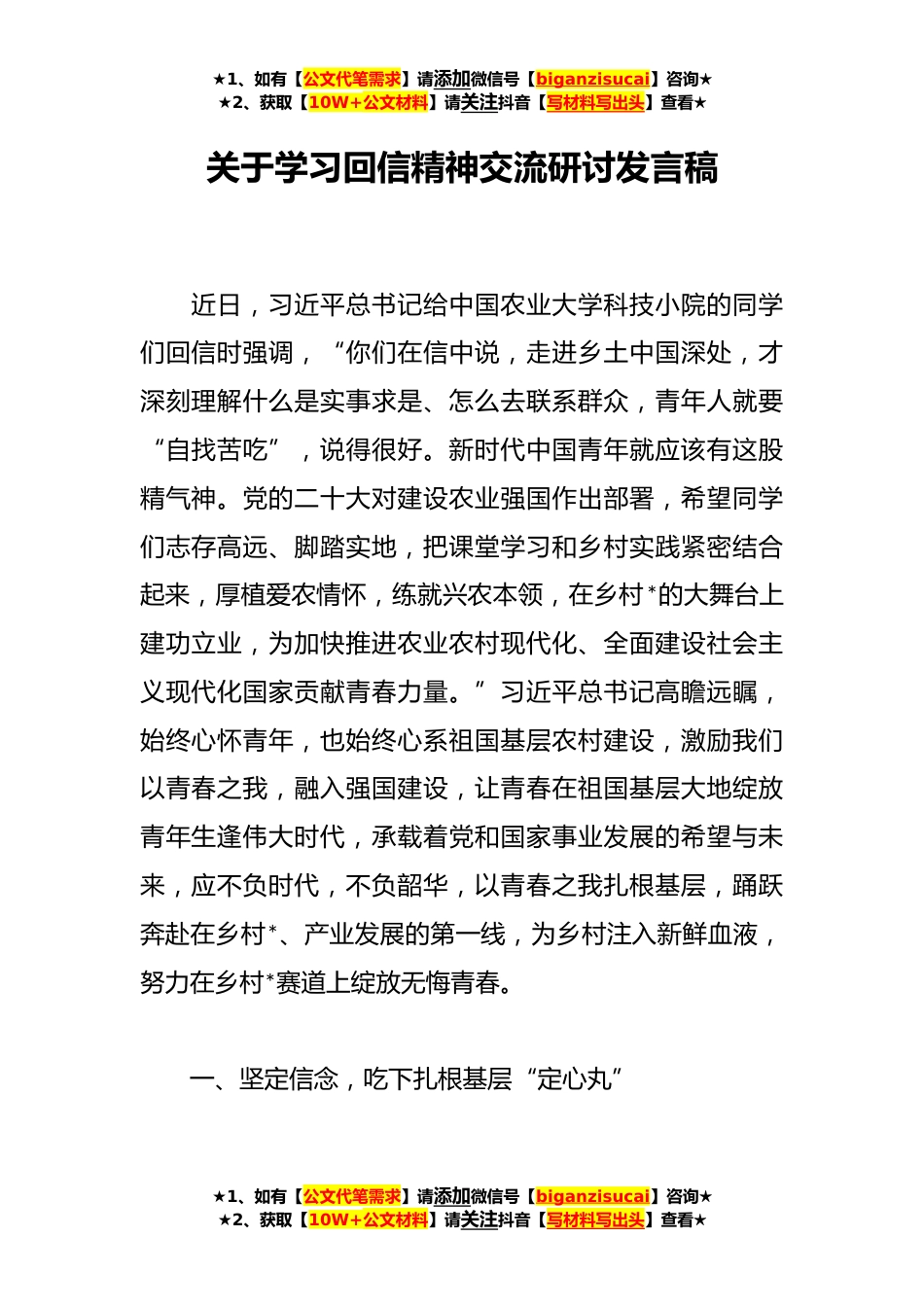 ★1、如有【公文代笔需求】请添加微信号【biganzisucai】咨询★★2、获取【10W+公文材料】请关注抖音【写材料写出头】查看★关于学习回信精神交流研讨发言稿近日,习近平总书记给中国农业大学科技小院的同学们回信时强调,“你们在信中说,走进乡土中国深处,才深刻理解什么是实事求是、怎么去联系群众,青年人就要“自找苦吃”,说得很好。新时代中国青年就应该有这股精气神。党的二十大对建设农业强国作出部署,希望同学们志存高远、脚踏实地,把课堂学习和乡村实践紧密结合起来,厚植爱农情怀,练就兴农本领,在乡村*的大舞台上建功立业,为加快推进农业农村现代化、全面建设社会主义现代化国家贡献青春力量。”习近平总书记高瞻远瞩,始终心怀青年,也始终心系祖国基层农村建设,激励我们以青春之我,融入强国...