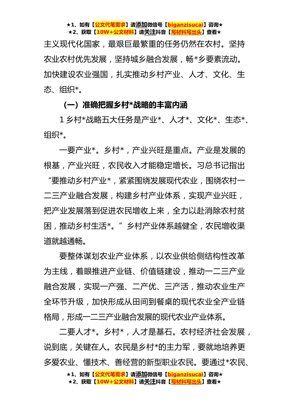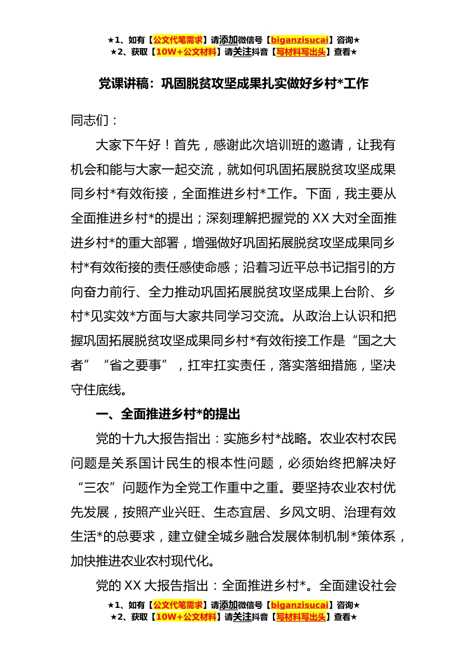 ★1、如有【公文代笔需求】请添加微信号【biganzisucai】咨询★★2、获取【10W+公文材料】请关注抖音【写材料写出头】查看★党课讲稿:巩固脱贫攻坚成果扎实做好乡村*工作同志们:大家下午好!首先,感谢此次培训班的邀请,让我有机会和能与大家一起交流,就如何巩固拓展脱贫攻坚成果同乡村*有效衔接,全面推进乡村*工作。下面,我主要从全面推进乡村*的提出;深刻理解把握党的XX大对全面推进乡村*的重大部署,增强做好巩固拓展脱贫攻坚成果同乡村*有效衔接的责任感使命感;沿着习近平总书记指引的方向奋力前行、全力推动巩固拓展脱贫攻坚成果上台阶、乡村*见实效*方面与大家共同学习交流。从政治上认识和把握巩固拓展脱贫攻坚成果同乡村*有效衔接工作是“国之大者”“省之要事”,扛牢扛实责任,落实落细措施,坚...