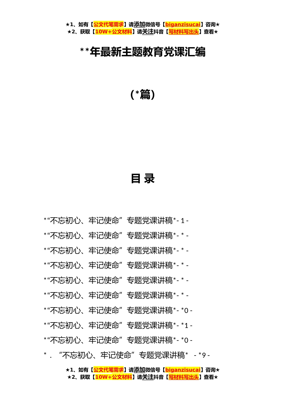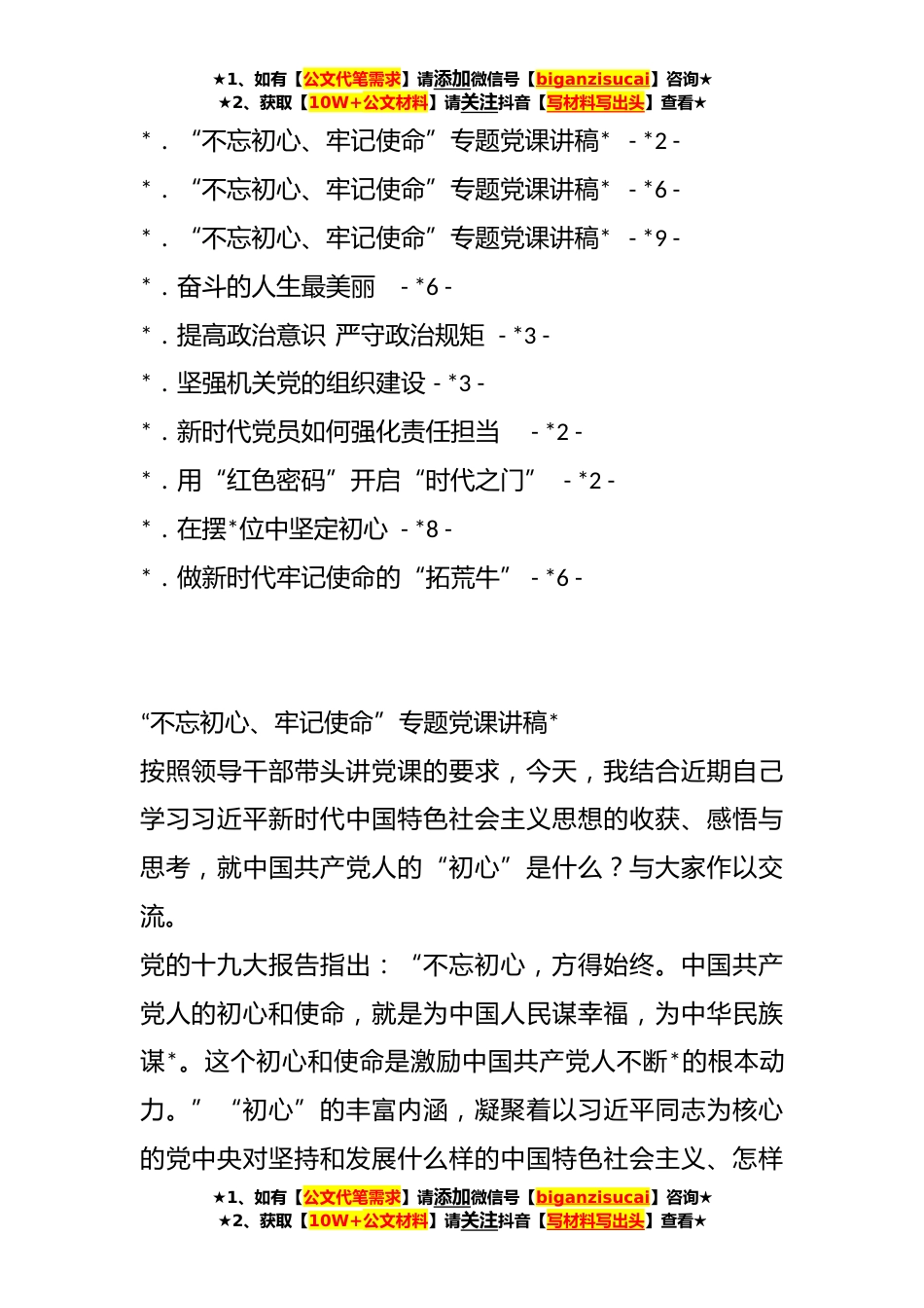 ★1、如有【公文代笔需求】请添加微信号【biganzisucai】咨询★★2、获取【10W+公文材料】请关注抖音【写材料写出头】查看★**年最新主题教育党课汇编(*篇)目录*“不忘初心、牢记使命”专题党课讲稿*-1-*“不忘初心、牢记使命”专题党课讲稿*-*-*“不忘初心、牢记使命”专题党课讲稿*-*-*“不忘初心、牢记使命”专题党课讲稿*-*-*“不忘初心、牢记使命”专题党课讲稿*-*-*“不忘初心、牢记使命”专题党课讲稿*-*-*“不忘初心、牢记使命”专题党课讲稿*-*0-*“不忘初心、牢记使命”专题党课讲稿*-*1-*“不忘初心、牢记使命”专题党课讲稿*-*0-*.“不忘初心、牢记使命”专题党课讲稿*-*9-★1、如有【公文代笔需求】请添加微信号【biganzisucai】咨询★★2、获取【10W+公文材料】请关注抖音【写材料写出头】查看★...