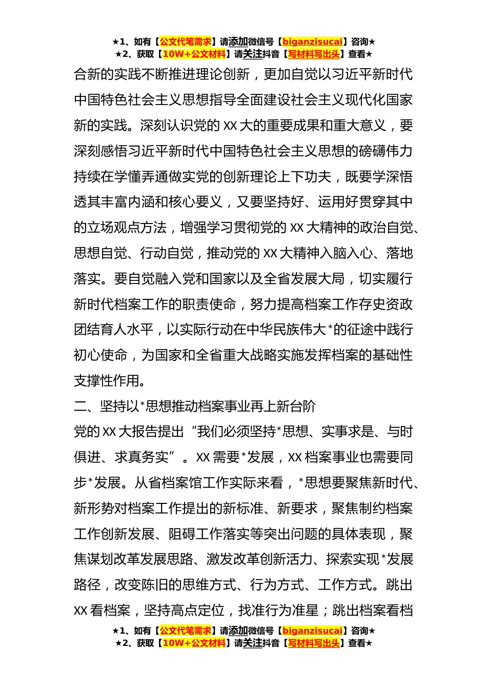 ★1、如有【公文代笔需求】请添加微信号【biganzisucai】咨询★★2、获取【10W+公文材料】请关注抖音【写材料写出头】查看★XX档案馆坚持守正创新推动档案事业高质量发展工作报告党的XX大擘画了全面建成社会主义现代化强国、以中国式现代化全面推进中华民族伟大*的*蓝图,为不断推进文化自信自强、增强实现中华民族伟大*的精神力量、做好新时代新征程档案工作提供了根本遵循,指明了*方向。深入学习、准确把握、认真贯彻党的XX大精神是当前和今后一个时期的首要政治任务,我们要切实把思想和行动统一到党的XX大确立的新理念新要求新任务上来,把党的XX大精神转化为指导实践、推动工作的强大动力,为XX全面*全方位*作出更大的档案贡献。一、坚定不移用党的创新理论指导新时代档案工作实践党的XX大报告指出:“用党...