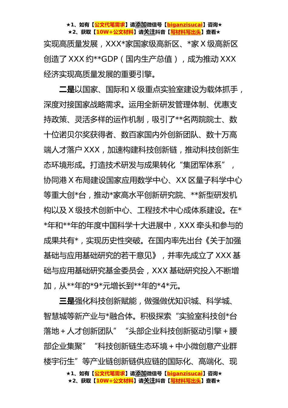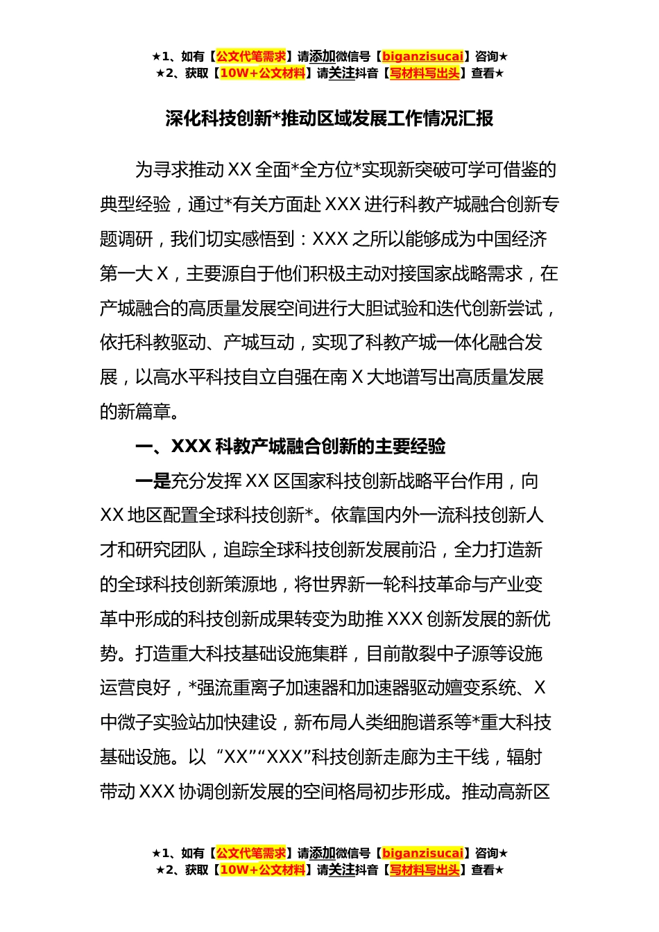 ★1、如有【公文代笔需求】请添加微信号【biganzisucai】咨询★★2、获取【10W+公文材料】请关注抖音【写材料写出头】查看★深化科技创新*推动区域发展工作情况汇报为寻求推动XX全面*全方位*实现新突破可学可借鉴的典型经验,通过*有关方面赴XXX进行科教产城融合创新专题调研,我们切实感悟到:XXX之所以能够成为中国经济第一大X,主要源自于他们积极主动对接国家战略需求,在产城融合的高质量发展空间进行大胆试验和迭代创新尝试,依托科教驱动、产城互动,实现了科教产城一体化融合发展,以高水平科技自立自强在南X大地谱写出高质量发展的新篇章。一、XXX科教产城融合创新的主要经验一是充分发挥XX区国家科技创新战略平台作用,向XX地区配置全球科技创新*。依靠国内外一流科技创新人才和研究团队,追踪全球科技...