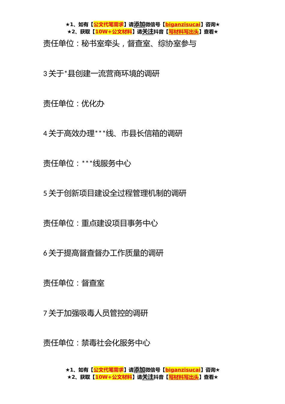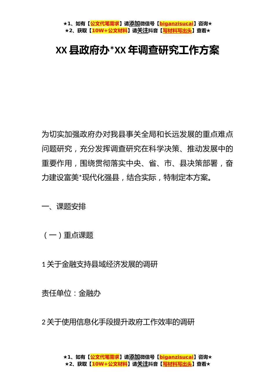 ★1、如有【公文代笔需求】请添加微信号【biganzisucai】咨询★★2、获取【10W+公文材料】请关注抖音【写材料写出头】查看★XX县政府办*XX年调查研究工作方案为切实加强政府办对我县事关全局和长远发展的重点难点问题研究,充分发挥调查研究在科学决策、推动发展中的重要作用,围绕贯彻落实中央、省、市、县决策部署,奋力建设富美*现代化强县,结合实际,特制定本方案。一、课题安排(一)重点课题1关于金融支持县域经济发展的调研责任单位:金融办2关于使用信息化手段提升政府工作效率的调研★1、如有【公文代笔需求】请添加微信号【biganzisucai】咨询★★2、获取【10W+公文材料】请关注抖音【写材料写出头】查看★★1、如有【公文代笔需求】请添加微信号【biganzisucai】咨询★★2、获取【10W+公文材料】请关...