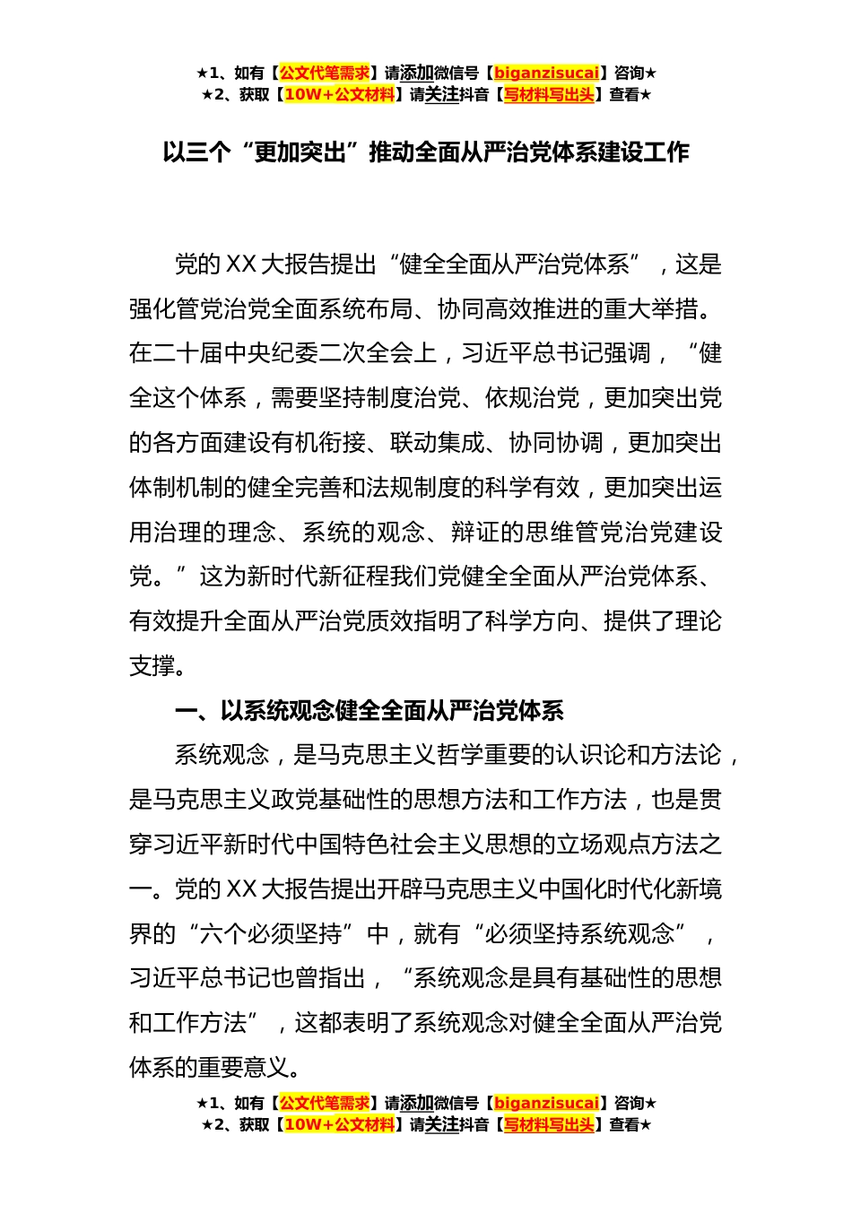 ★1、如有【公文代笔需求】请添加微信号【biganzisucai】咨询★★2、获取【10W+公文材料】请关注抖音【写材料写出头】查看★以三个“更加突出”推动全面从严治党体系建设工作党的XX大报告提出“健全全面从严治党体系”,这是强化管党治党全面系统布局、协同高效推进的重大举措。在二十届中央纪委二次全会上,习近平总书记强调,“健全这个体系,需要坚持制度治党、依规治党,更加突出党的各方面建设有机衔接、联动集成、协同协调,更加突出体制机制的健全完善和法规制度的科学有效,更加突出运用治理的理念、系统的观念、辩证的思维管党治党建设党。”这为新时代新征程我们党健全全面从严治党体系、有效提升全面从严治党质效指明了科学方向、提供了理论支撑。一、以系统观念健全全面从严治党体系系统观念,是马克...