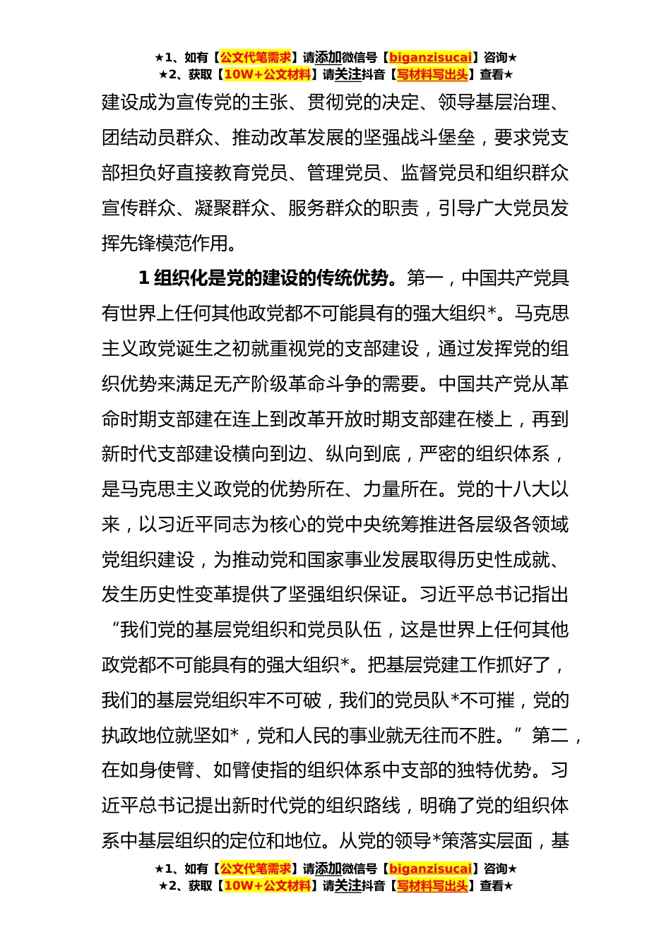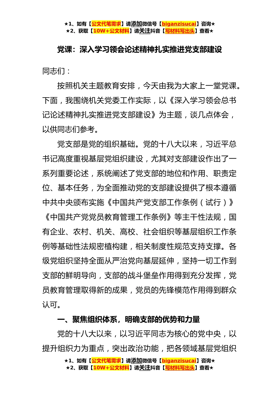 ★1、如有【公文代笔需求】请添加微信号【biganzisucai】咨询★★2、获取【10W+公文材料】请关注抖音【写材料写出头】查看★党课:深入学习领会论述精神扎实推进党支部建设同志们:按照机关主题教育安排,今天由我为大家上一堂党课。下面,我围绕机关党委工作实际,以《深入学习领会总书记论述精神扎实推进党支部建设》为主题,谈几点体会,以供同志们参考。党支部是党的组织基础。党的十八大以来,习近平总书记高度重视基层党组织建设,尤其对支部建设作出了一系列重要论述,系统阐述了党支部的地位和作用、职责定位、基本任务,为全面推动党的支部建设提供了根本遵循中共中央颁布实施《中国共产党支部工作条例(试行)》《中国共产党党员教育管理工作条例》等主干性法规,国有企业、农村、机关、高校、社会组织...