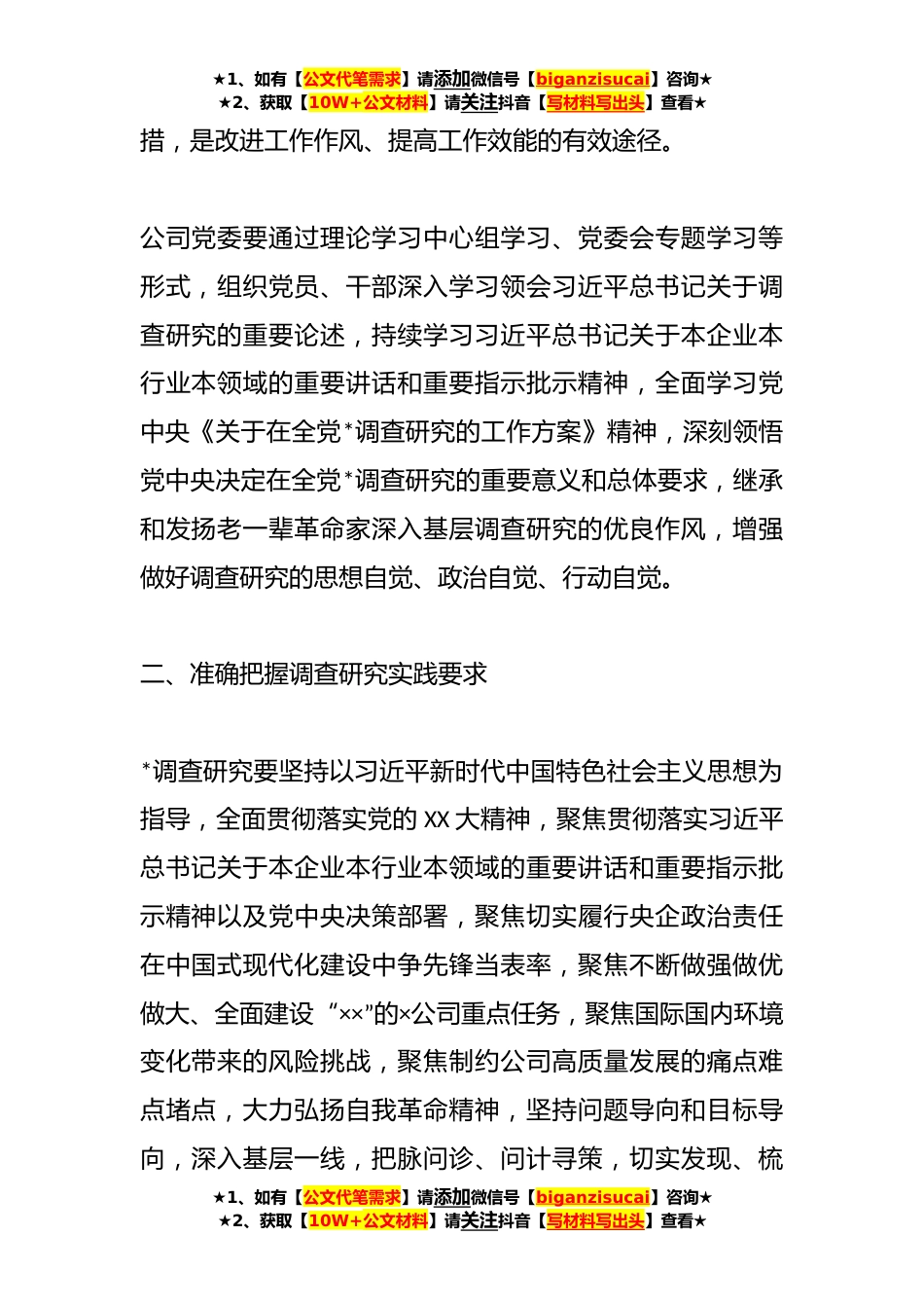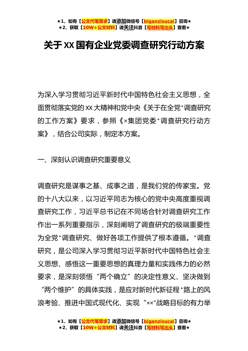 ★1、如有【公文代笔需求】请添加微信号【biganzisucai】咨询★★2、获取【10W+公文材料】请关注抖音【写材料写出头】查看★关于XX国有企业党委调查研究行动方案为深入学习贯彻习近平新时代中国特色社会主义思想,全面贯彻落实党的XX大精神和党中央《关于在全党*调查研究的工作方案》要求,参照《×集团党委*调查研究行动方案》,结合公司实际,制定本方案。一、深刻认识调查研究重要意义调查研究是谋事之基、成事之道,是我们党的传家宝。党的十八大以来,以习近平同志为核心的党中央高度重视调查研究工作,习近平总书记在不同场合针对调查研究工作作出一系列重要指示,深刻阐明了调查研究的极端重要性为全党*调查研究、做好各项工作提供了根本遵循。*调查研究,是公司深入学习贯彻习近平新时代中国特色社会主义...