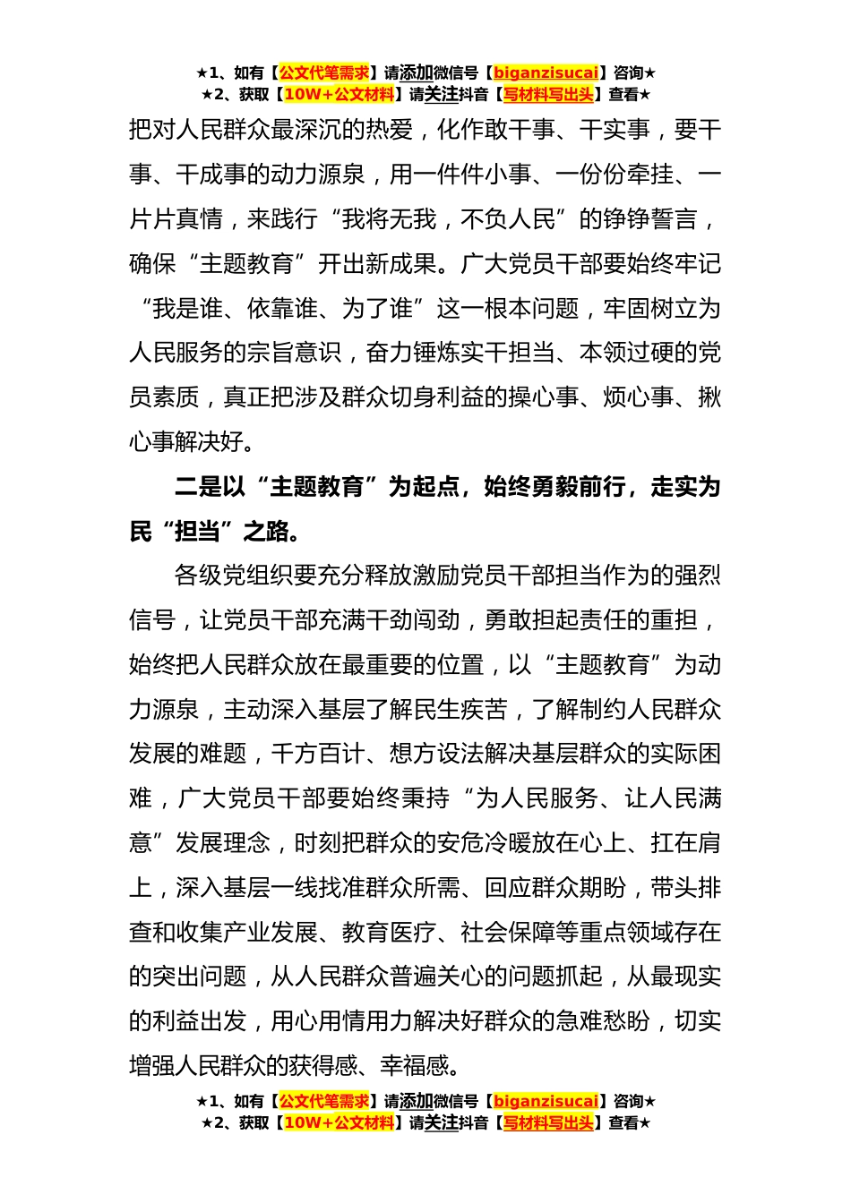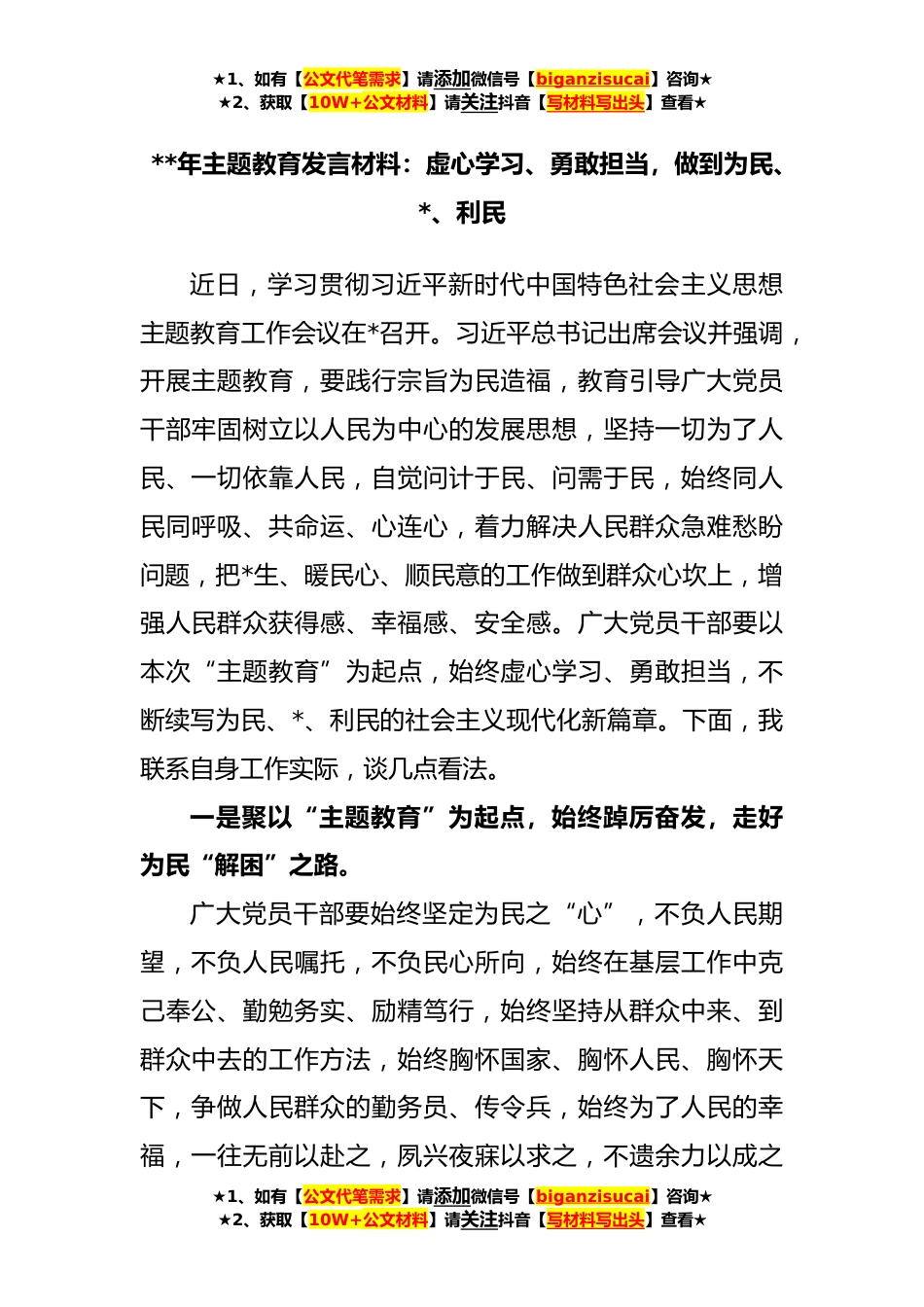★1、如有【公文代笔需求】请添加微信号【biganzisucai】咨询★★2、获取【10W+公文材料】请关注抖音【写材料写出头】查看★**年主题教育发言材料:虚心学习、勇敢担当,做到为民、*、利民近日,学习贯彻习近平新时代中国特色社会主义思想主题教育工作会议在*召开。习近平总书记出席会议并强调,开展主题教育,要践行宗旨为民造福,教育引导广大党员干部牢固树立以人民为中心的发展思想,坚持一切为了人民、一切依靠人民,自觉问计于民、问需于民,始终同人民同呼吸、共命运、心连心,着力解决人民群众急难愁盼问题,把*生、暖民心、顺民意的工作做到群众心坎上,增强人民群众获得感、幸福感、安全感。广大党员干部要以本次“主题教育”为起点,始终虚心学习、勇敢担当,不断续写为民、*、利民的社会主义现代化新...