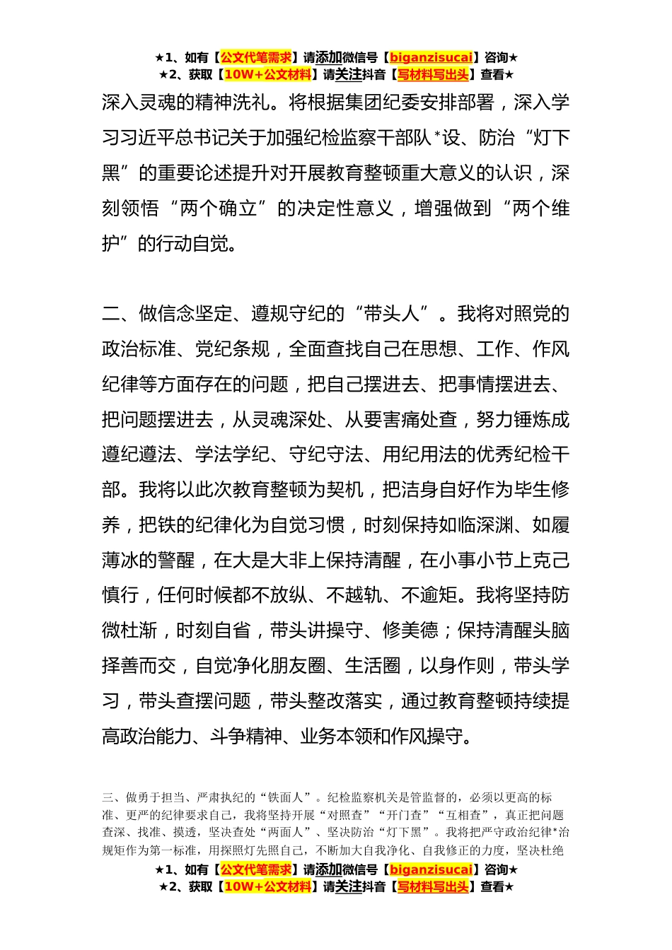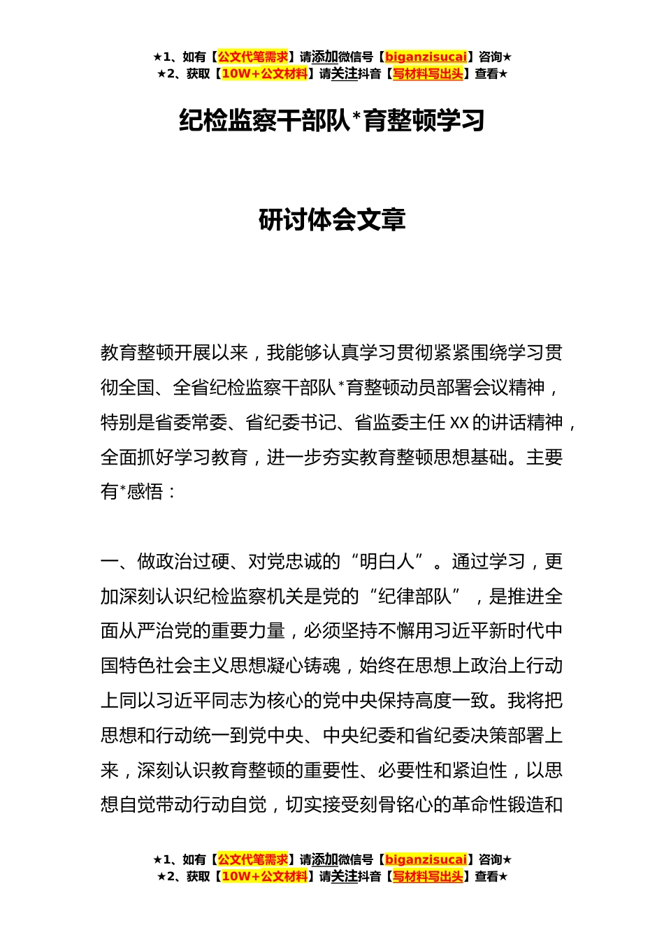 ★1、如有【公文代笔需求】请添加微信号【biganzisucai】咨询★★2、获取【10W+公文材料】请关注抖音【写材料写出头】查看★纪检监察干部队*育整顿学习研讨体会文章教育整顿开展以来,我能够认真学习贯彻紧紧围绕学习贯彻全国、全省纪检监察干部队*育整顿动员部署会议精神,特别是省委常委、省纪委书记、省监委主任XX的讲话精神,全面抓好学习教育,进一步夯实教育整顿思想基础。主要有*感悟:一、做政治过硬、对党忠诚的“明白人”。通过学习,更加深刻认识纪检监察机关是党的“纪律部队”,是推进全面从严治党的重要力量,必须坚持不懈用习近平新时代中国特色社会主义思想凝心铸魂,始终在思想上政治上行动上同以习近平同志为核心的党中央保持高度一致。我将把思想和行动统一到党中央、中央纪委和省纪委决策部署...