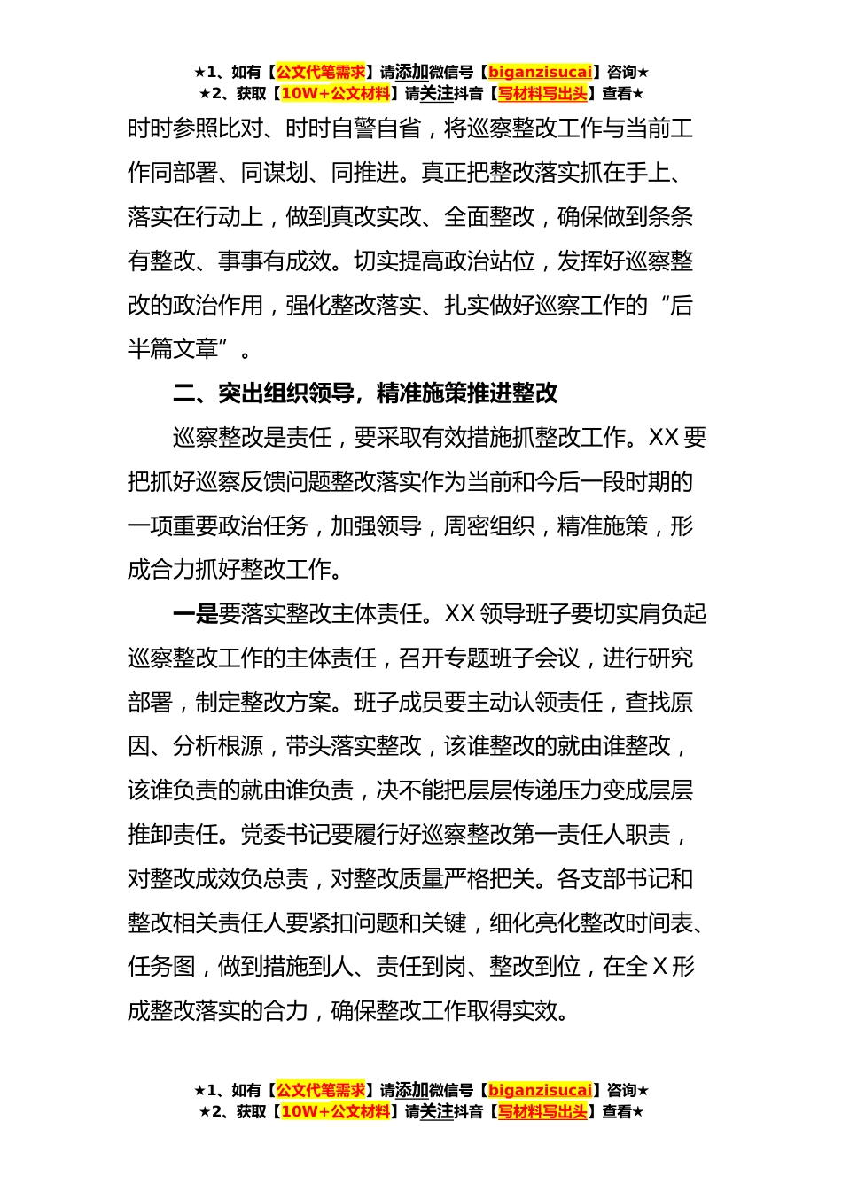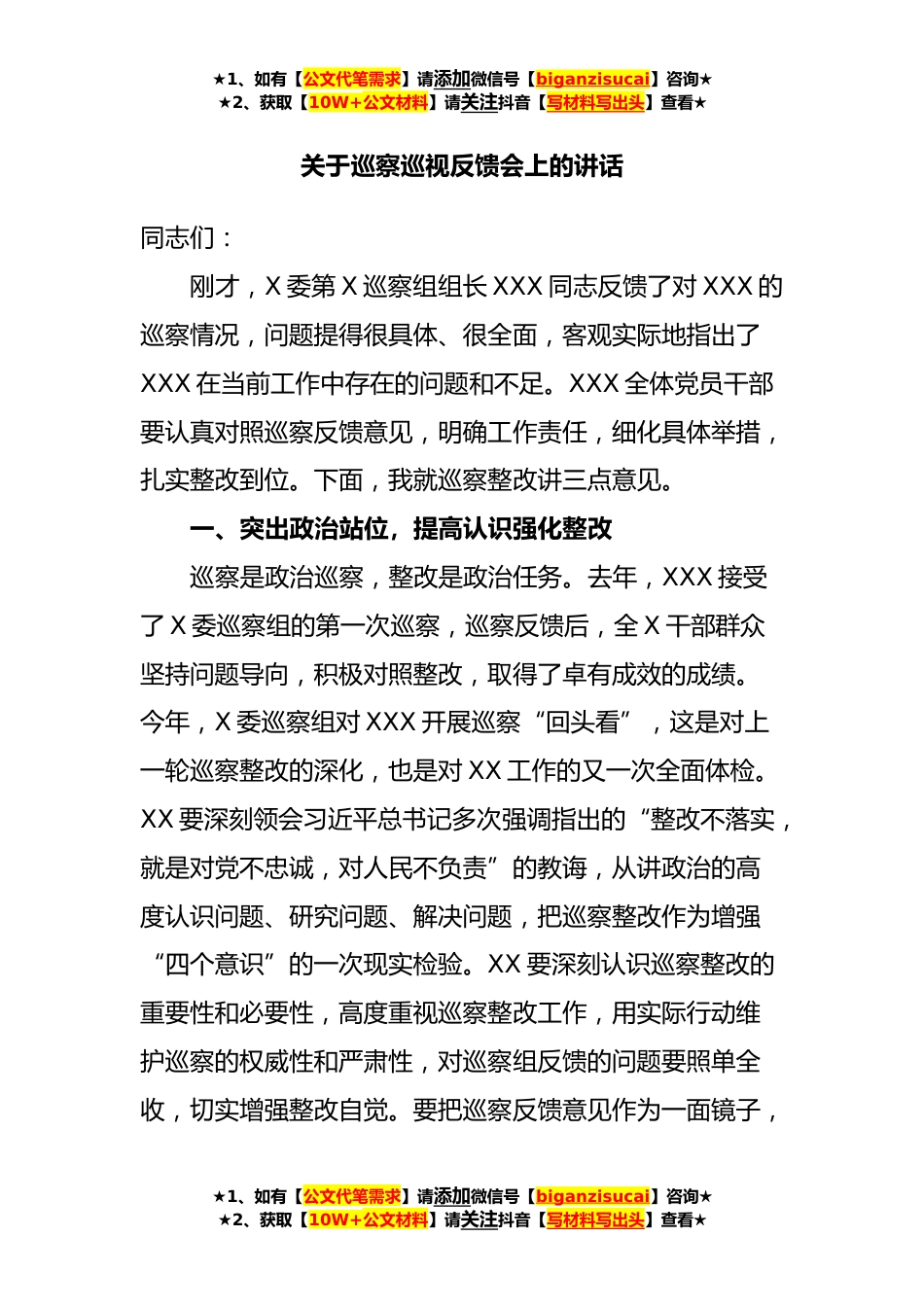 ★1、如有【公文代笔需求】请添加微信号【biganzisucai】咨询★★2、获取【10W+公文材料】请关注抖音【写材料写出头】查看★关于巡察巡视反馈会上的讲话同志们:刚才,X委第X巡察组组长XXX同志反馈了对XXX的巡察情况,问题提得很具体、很全面,客观实际地指出了XXX在当前工作中存在的问题和不足。XXX全体党员干部要认真对照巡察反馈意见,明确工作责任,细化具体举措,扎实整改到位。下面,我就巡察整改讲三点意见。一、突出政治站位,提高认识强化整改巡察是政治巡察,整改是政治任务。去年,XXX接受了X委巡察组的第一次巡察,巡察反馈后,全X干部群众坚持问题导向,积极对照整改,取得了卓有成效的成绩。今年,X委巡察组对XXX开展巡察“回头看”,这是对上一轮巡察整改的深化,也是对XX工作的又一次全面体检。XX...