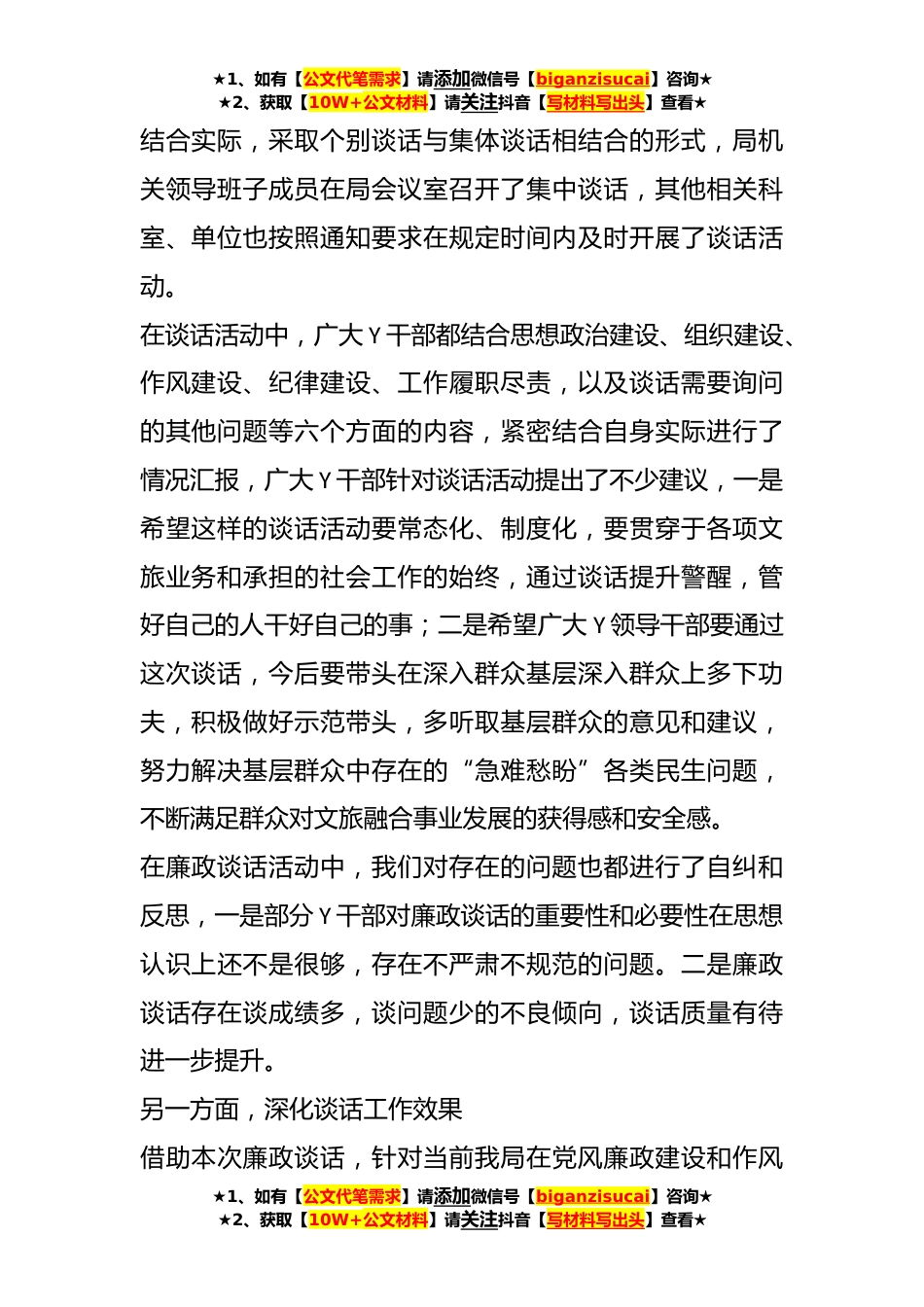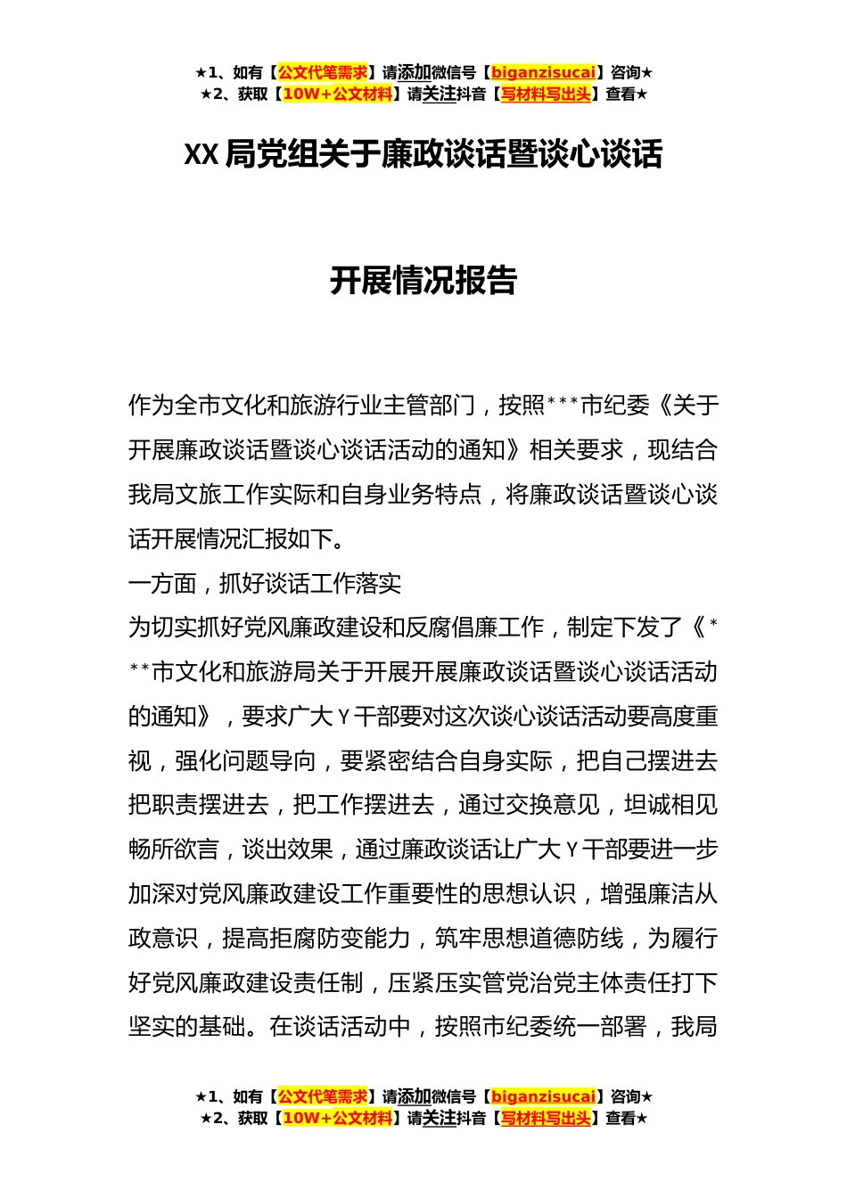 ★1、如有【公文代笔需求】请添加微信号【biganzisucai】咨询★★2、获取【10W+公文材料】请关注抖音【写材料写出头】查看★XX局党组关于廉政谈话暨谈心谈话开展情况报告作为全市文化和旅游行业主管部门,按照***市纪委《关于开展廉政谈话暨谈心谈话活动的通知》相关要求,现结合我局文旅工作实际和自身业务特点,将廉政谈话暨谈心谈话开展情况汇报如下。一方面,抓好谈话工作落实为切实抓好党风廉政建设和反腐倡廉工作,制定下发了《***市文化和旅游局关于开展开展廉政谈话暨谈心谈话活动的通知》,要求广大Y干部要对这次谈心谈话活动要高度重视,强化问题导向,要紧密结合自身实际,把自己摆进去把职责摆进去,把工作摆进去,通过交换意见,坦诚相见畅所欲言,谈出效果,通过廉政谈话让广大Y干部要进一步加深对...