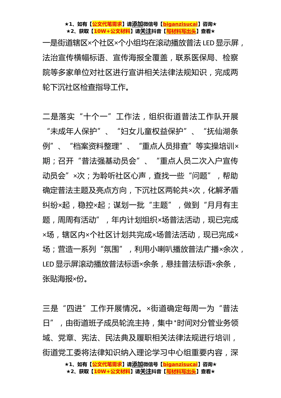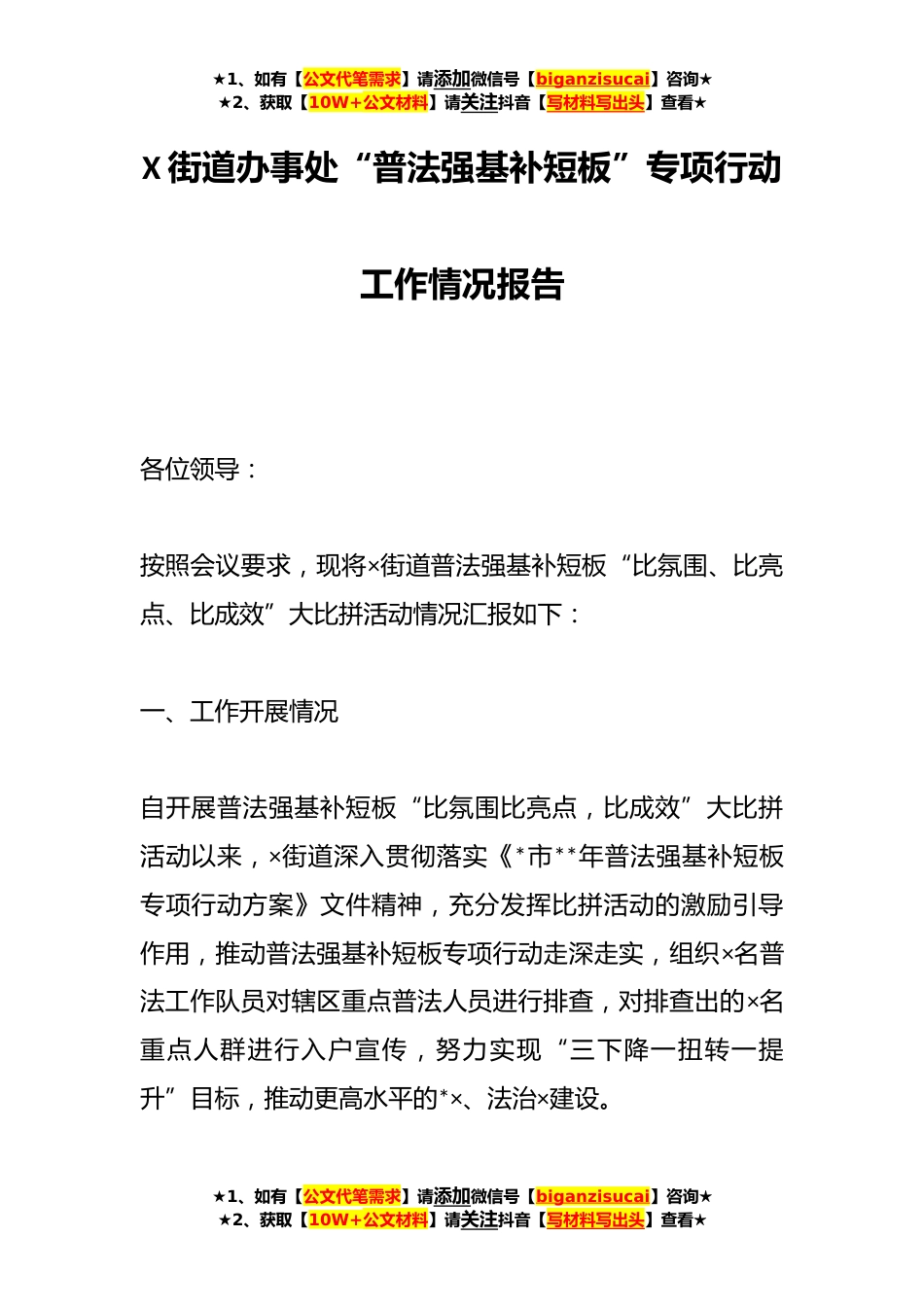 ★1、如有【公文代笔需求】请添加微信号【biganzisucai】咨询★★2、获取【10W+公文材料】请关注抖音【写材料写出头】查看★X街道办事处“普法强基补短板”专项行动工作情况报告各位领导:按照会议要求,现将×街道普法强基补短板“比氛围、比亮点、比成效”大比拼活动情况汇报如下:一、工作开展情况自开展普法强基补短板“比氛围比亮点,比成效”大比拼活动以来,×街道深入贯彻落实《*市**年普法强基补短板专项行动方案》文件精神,充分发挥比拼活动的激励引导作用,推动普法强基补短板专项行动走深走实,组织×名普法工作队员对辖区重点普法人员进行排查,对排查出的×名重点人群进行入户宣传,努力实现“三下降一扭转一提升”目标,推动更高水平的*×、法治×建设。★1、如有【公文代笔需求】请添加微信号【b...