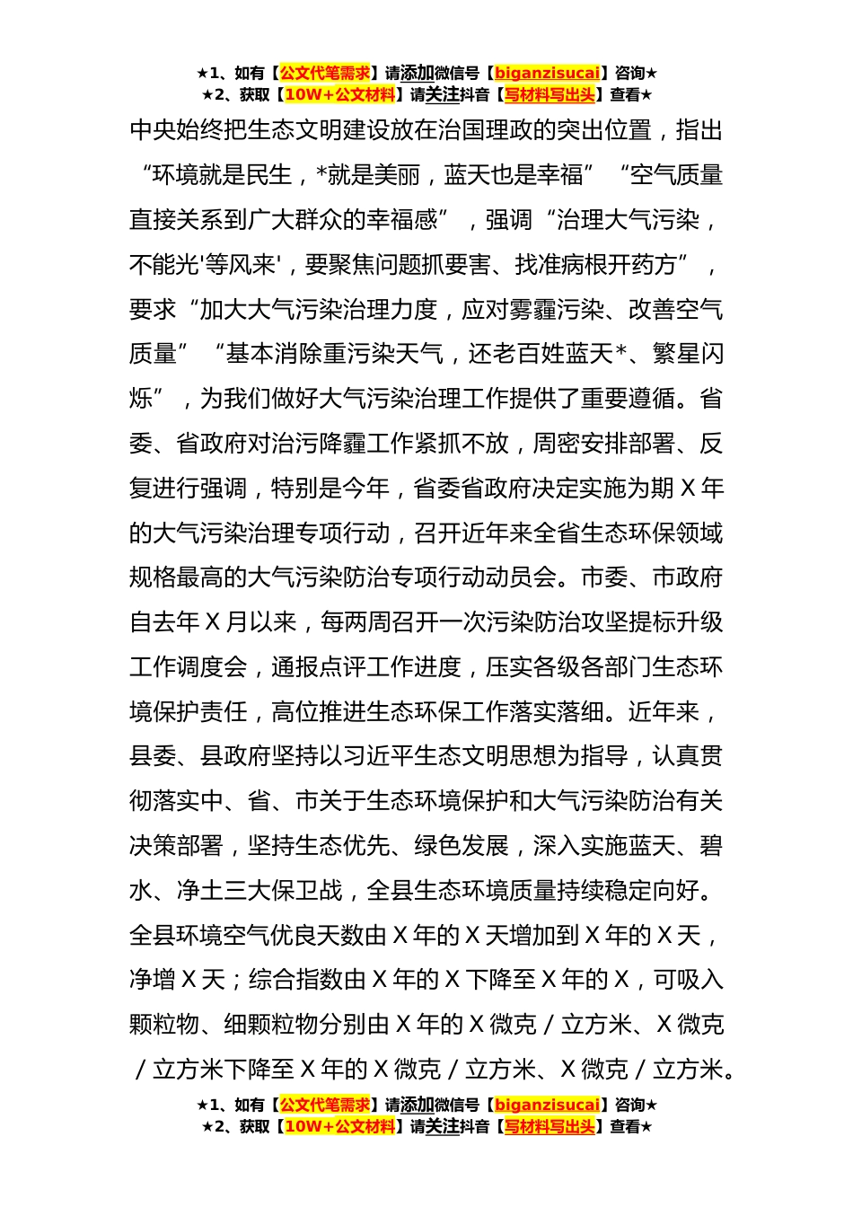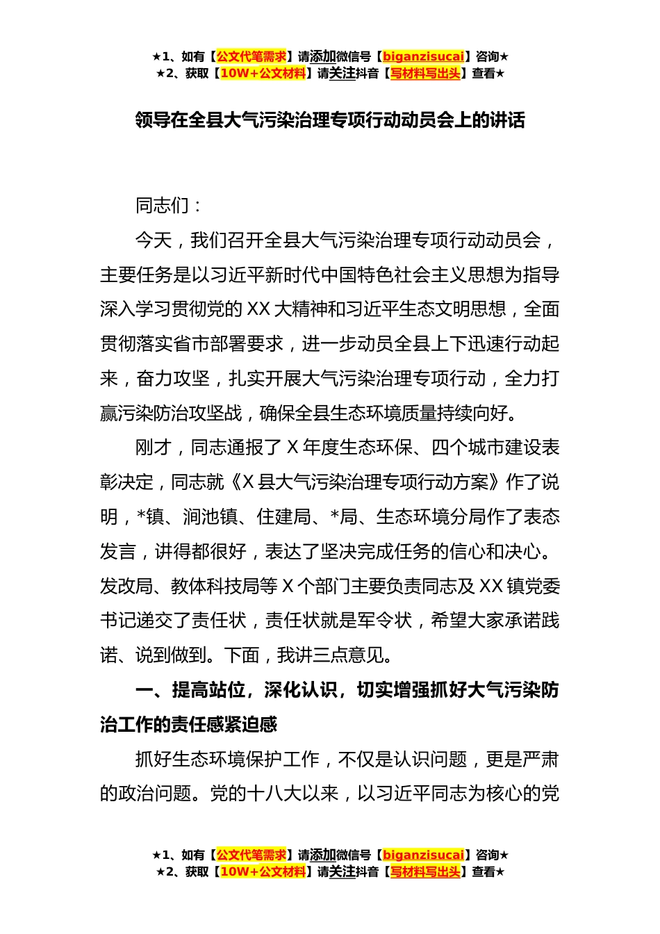 ★1、如有【公文代笔需求】请添加微信号【biganzisucai】咨询★★2、获取【10W+公文材料】请关注抖音【写材料写出头】查看★领导在全县大气污染治理专项行动动员会上的讲话同志们:今天,我们召开全县大气污染治理专项行动动员会,主要任务是以习近平新时代中国特色社会主义思想为指导深入学习贯彻党的XX大精神和习近平生态文明思想,全面贯彻落实省市部署要求,进一步动员全县上下迅速行动起来,奋力攻坚,扎实开展大气污染治理专项行动,全力打赢污染防治攻坚战,确保全县生态环境质量持续向好。刚才,同志通报了X年度生态环保、四个城市建设表彰决定,同志就《X县大气污染治理专项行动方案》作了说明,*镇、涧池镇、住建局、*局、生态环境分局作了表态发言,讲得都很好,表达了坚决完成任务的信心和决心。发改...
