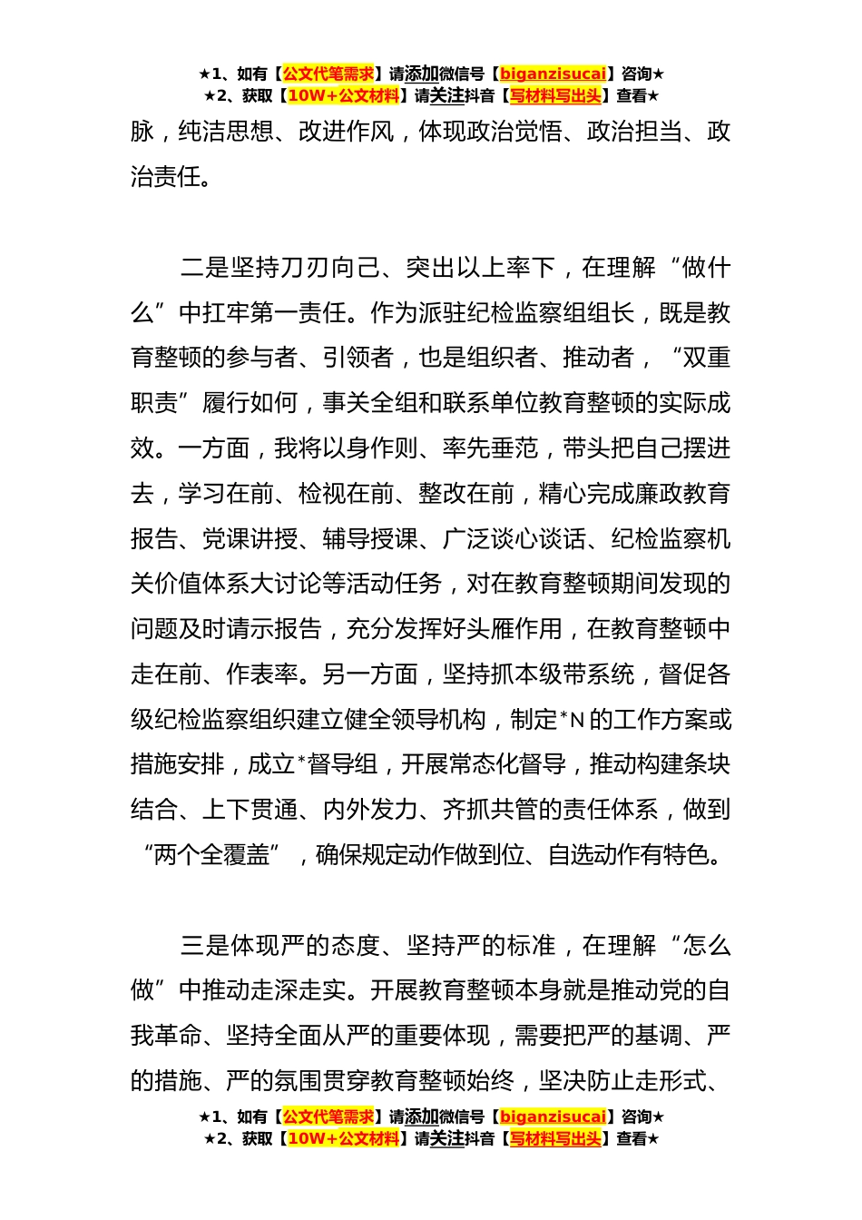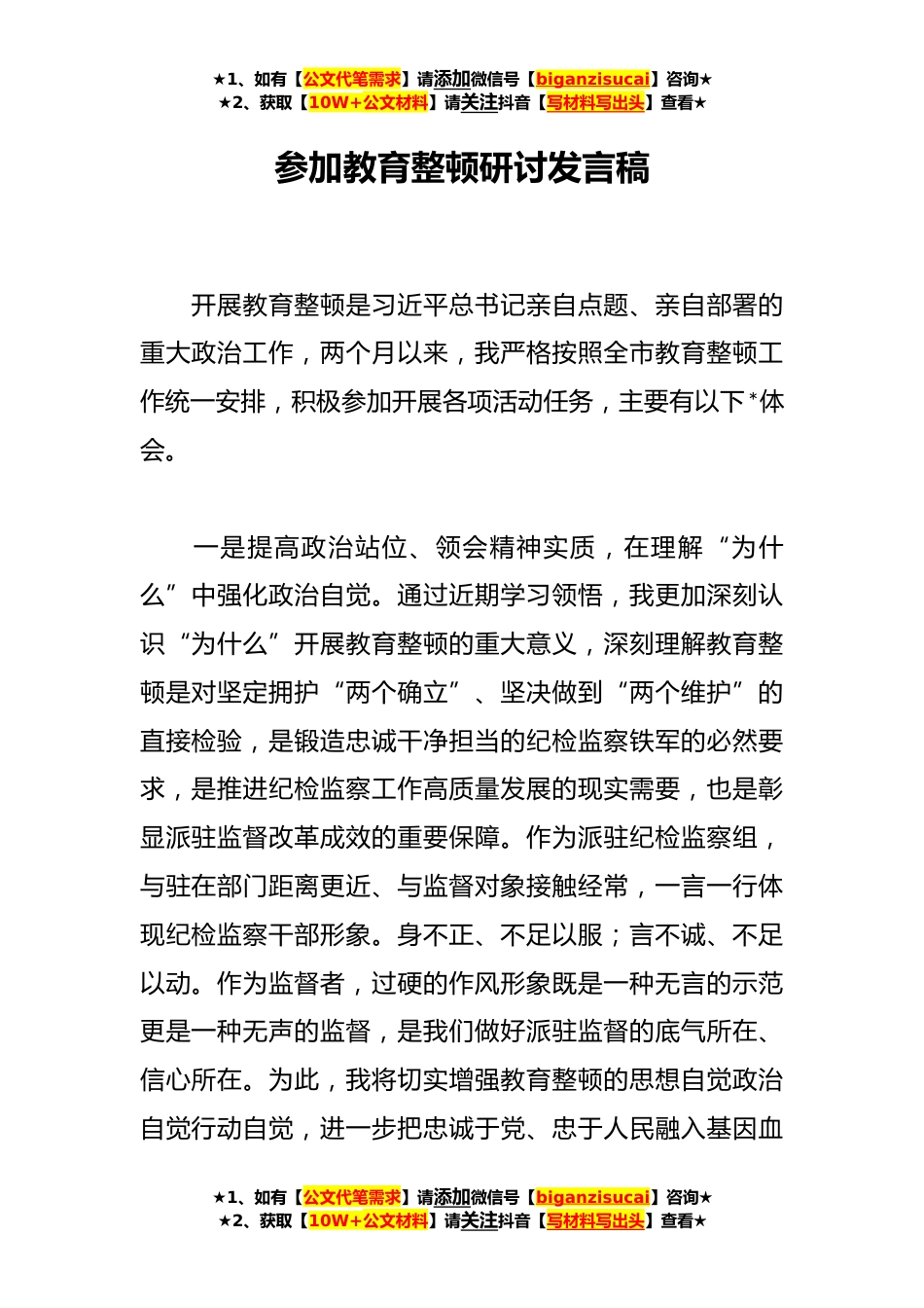 ★1、如有【公文代笔需求】请添加微信号【biganzisucai】咨询★★2、获取【10W+公文材料】请关注抖音【写材料写出头】查看★参加教育整顿研讨发言稿开展教育整顿是习近平总书记亲自点题、亲自部署的重大政治工作,两个月以来,我严格按照全市教育整顿工作统一安排,积极参加开展各项活动任务,主要有以下*体会。一是提高政治站位、领会精神实质,在理解“为什么”中强化政治自觉。通过近期学习领悟,我更加深刻认识“为什么”开展教育整顿的重大意义,深刻理解教育整顿是对坚定拥护“两个确立”、坚决做到“两个维护”的直接检验,是锻造忠诚干净担当的纪检监察铁军的必然要求,是推进纪检监察工作高质量发展的现实需要,也是彰显派驻监督改革成效的重要保障。作为派驻纪检监察组,与驻在部门距离更近、与监督对象...