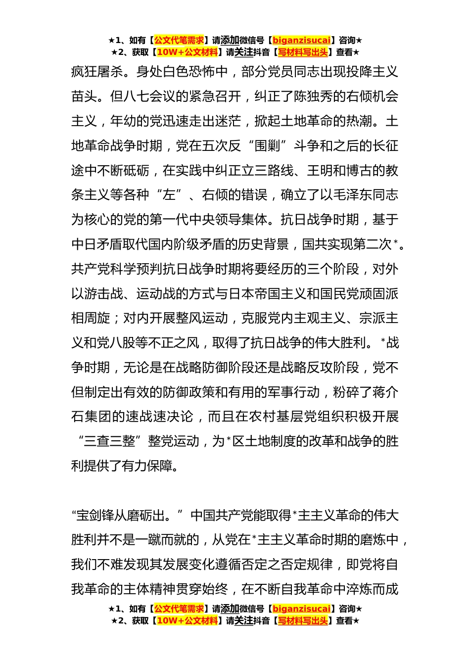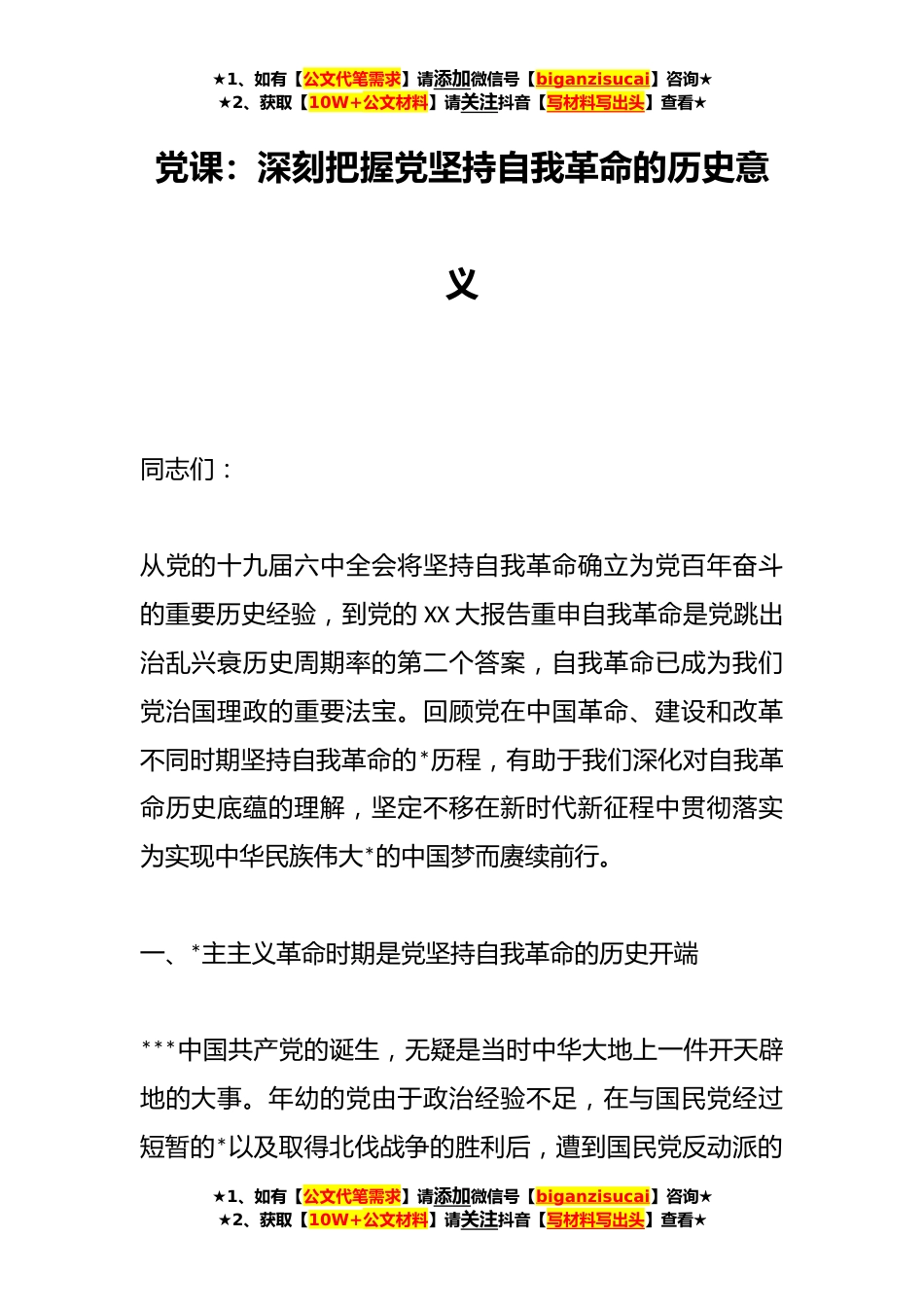 ★1、如有【公文代笔需求】请添加微信号【biganzisucai】咨询★★2、获取【10W+公文材料】请关注抖音【写材料写出头】查看★党课:深刻把握党坚持自我革命的历史意义同志们:从党的十九届六中全会将坚持自我革命确立为党百年奋斗的重要历史经验,到党的XX大报告重申自我革命是党跳出治乱兴衰历史周期率的第二个答案,自我革命已成为我们党治国理政的重要法宝。回顾党在中国革命、建设和改革不同时期坚持自我革命的*历程,有助于我们深化对自我革命历史底蕴的理解,坚定不移在新时代新征程中贯彻落实为实现中华民族伟大*的中国梦而赓续前行。一、*主主义革命时期是党坚持自我革命的历史开端***中国共产党的诞生,无疑是当时中华大地上一件开天辟地的大事。年幼的党由于政治经验不足,在与国民党经过短暂的*以及取得...