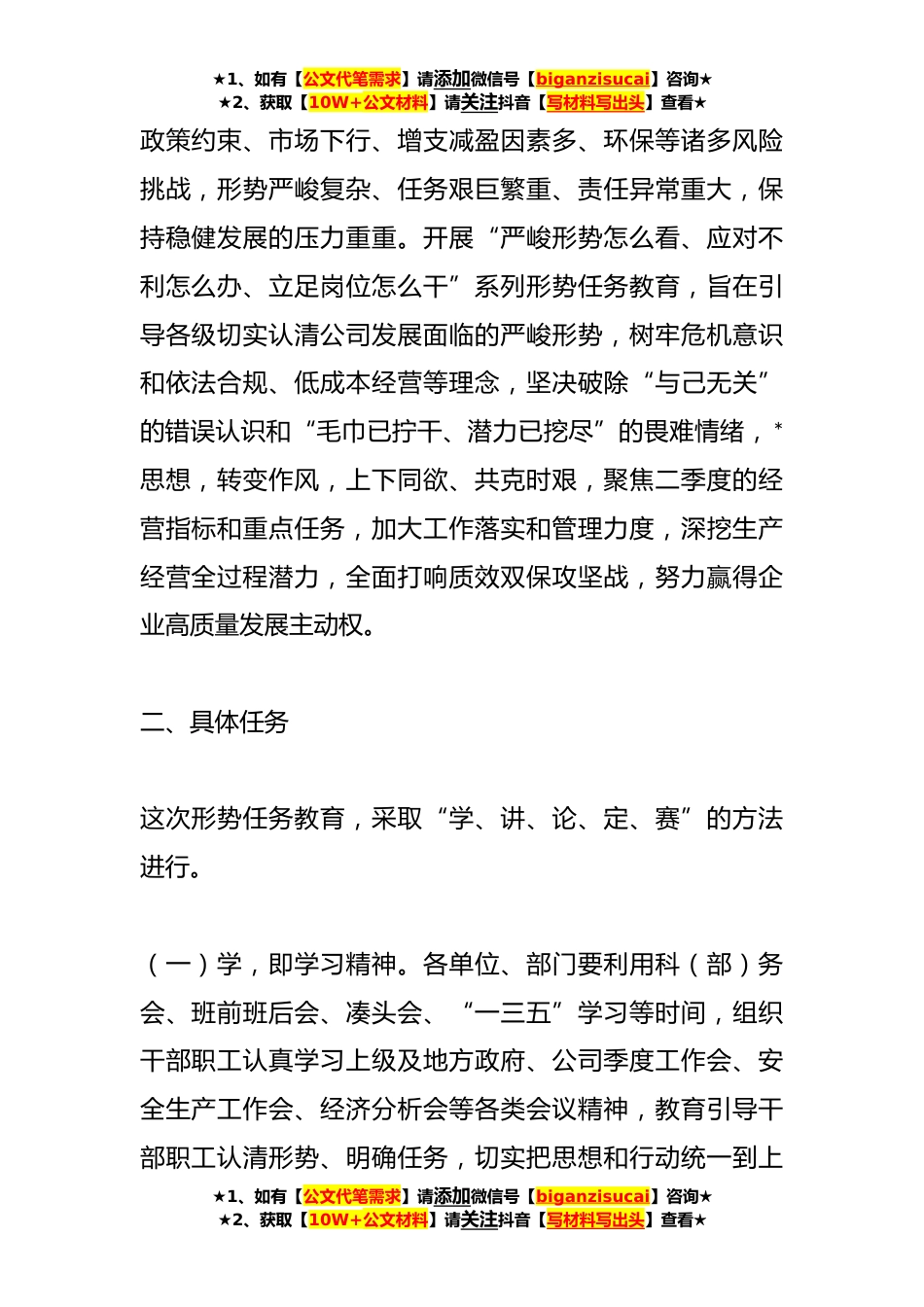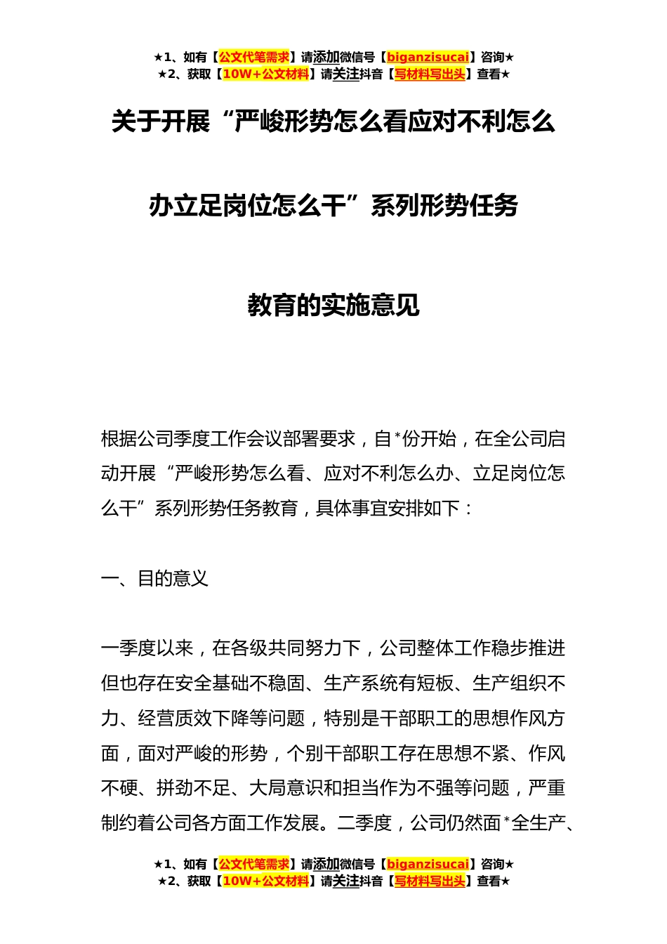 ★1、如有【公文代笔需求】请添加微信号【biganzisucai】咨询★★2、获取【10W+公文材料】请关注抖音【写材料写出头】查看★关于开展“严峻形势怎么看应对不利怎么办立足岗位怎么干”系列形势任务教育的实施意见根据公司季度工作会议部署要求,自*份开始,在全公司启动开展“严峻形势怎么看、应对不利怎么办、立足岗位怎么干”系列形势任务教育,具体事宜安排如下:一、目的意义一季度以来,在各级共同努力下,公司整体工作稳步推进但也存在安全基础不稳固、生产系统有短板、生产组织不力、经营质效下降等问题,特别是干部职工的思想作风方面,面对严峻的形势,个别干部职工存在思想不紧、作风不硬、拼劲不足、大局意识和担当作为不强等问题,严重制约着公司各方面工作发展。二季度,公司仍然面*全生产、★1、如有...