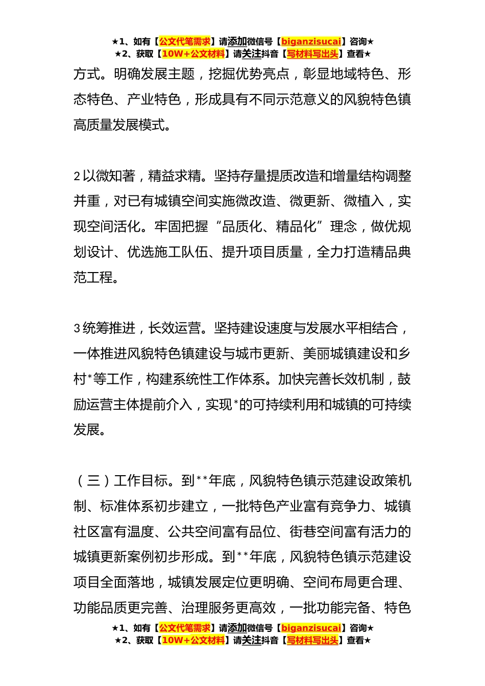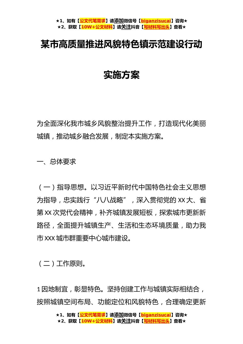 ★1、如有【公文代笔需求】请添加微信号【biganzisucai】咨询★★2、获取【10W+公文材料】请关注抖音【写材料写出头】查看★某市高质量推进风貌特色镇示范建设行动实施方案为全面深化我市城乡风貌整治提升工作,打造现代化美丽城镇,推动城乡融合发展,制定本实施方案。一、总体要求(一)指导思想。以习近平新时代中国特色社会主义思想为指导,忠实践行“八八战略”,深入贯彻党的XX大、省第XX次党代会精神,补齐城镇发展短板,探索城市更新新路径,全面提升城镇生产、生活和生态环境质量,助力我市XXX城市群重要中心城市建设。(二)工作原则。1因地制宜,彰显特色。坚持创建工作与城镇实际相结合,按照城镇空间布局、功能定位和风貌特色,合理确定更新★1、如有【公文代笔需求】请添加微信号【biganzisucai】咨...