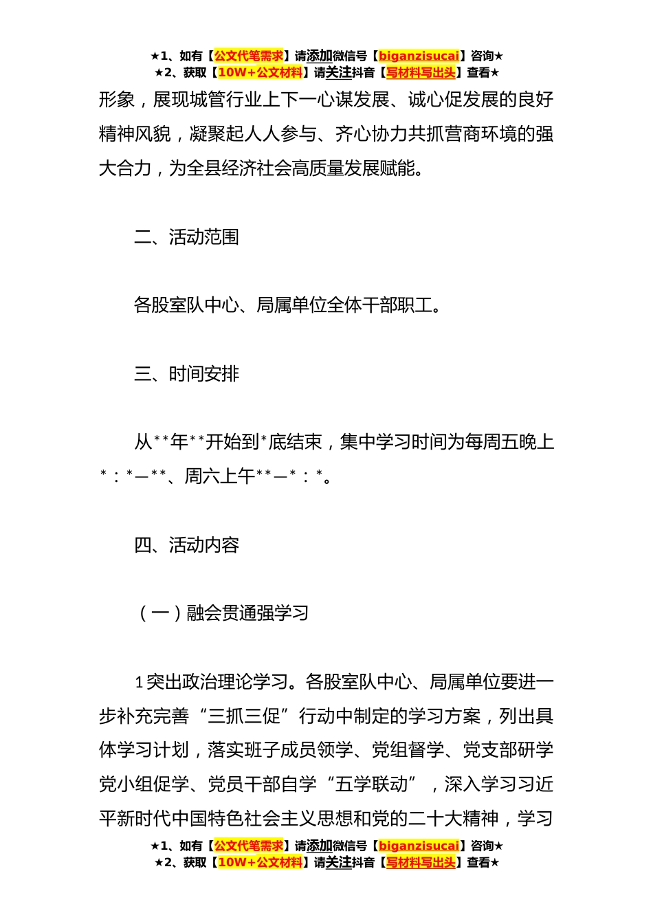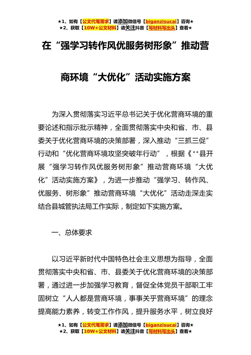 ★1、如有【公文代笔需求】请添加微信号【biganzisucai】咨询★★2、获取【10W+公文材料】请关注抖音【写材料写出头】查看★在“强学习转作风优服务树形象”推动营商环境“大优化”活动实施方案为深入贯彻落实习近平总书记关于优化营商环境的重要论述和指示批示精神,全面贯彻落实中央和省、市、县委关于优化营商环境的决策部署,深入推动“三抓三促”行动和“优化营商环境攻坚突破年行动”,根据《**县开展“强学习转作风优服务树形象”推动营商环境“大优化”活动实施方案》,为进一步推动“强学习、转作风、优服务、树形象”推动营商环境“大优化”活动走深走实结合县城管执法局工作实际,制定如下实施方案。一、总体要求以习近平新时代中国特色社会主义思想为指导,全面贯彻落实中央和省、市、县委关于优化营...