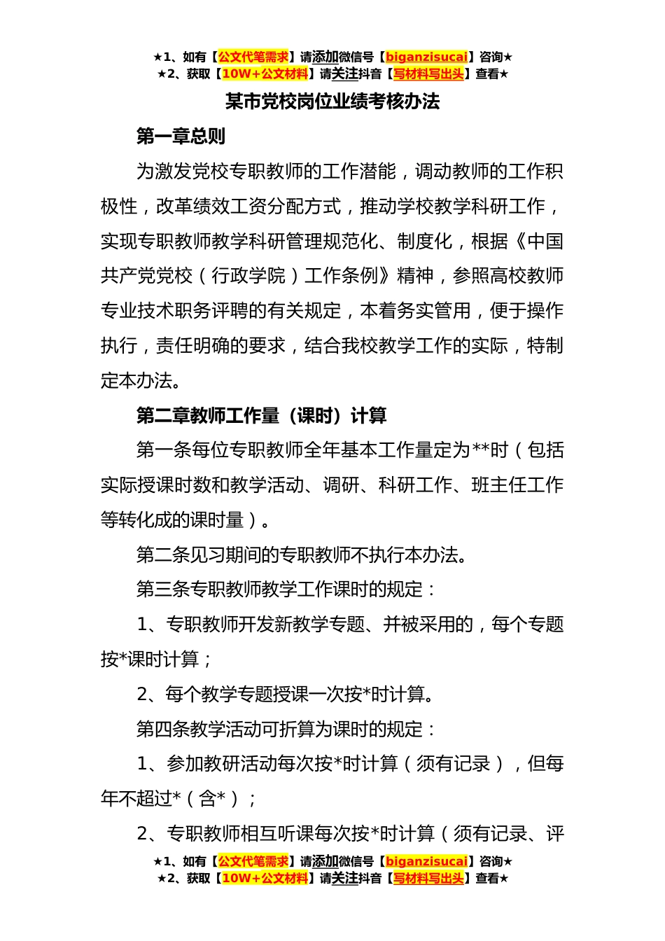 ★1、如有【公文代笔需求】请添加微信号【biganzisucai】咨询★★2、获取【10W+公文材料】请关注抖音【写材料写出头】查看★某市党校岗位业绩考核办法第一章总则为激发党校专职教师的工作潜能,调动教师的工作积极性,改革绩效工资分配方式,推动学校教学科研工作,实现专职教师教学科研管理规范化、制度化,根据《中国共产党党校(行政学院)工作条例》精神,参照高校教师专业技术职务评聘的有关规定,本着务实管用,便于操作执行,责任明确的要求,结合我校教学工作的实际,特制定本办法。第二章教师工作量(课时)计算第一条每位专职教师全年基本工作量定为**时(包括实际授课时数和教学活动、调研、科研工作、班主任工作等转化成的课时量)。第二条见习期间的专职教师不执行本办法。第三条专职教师教学工作课...