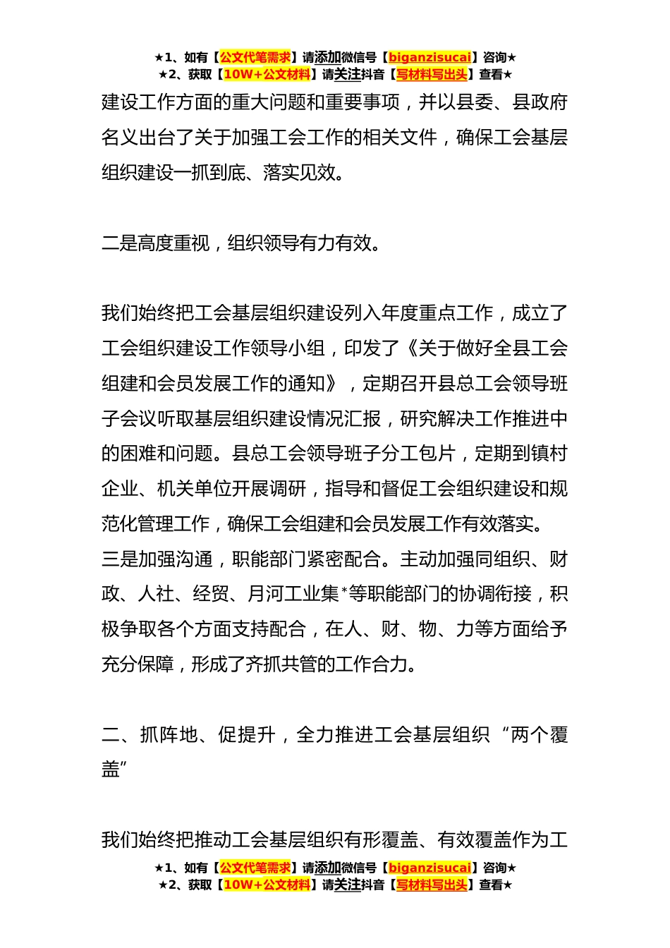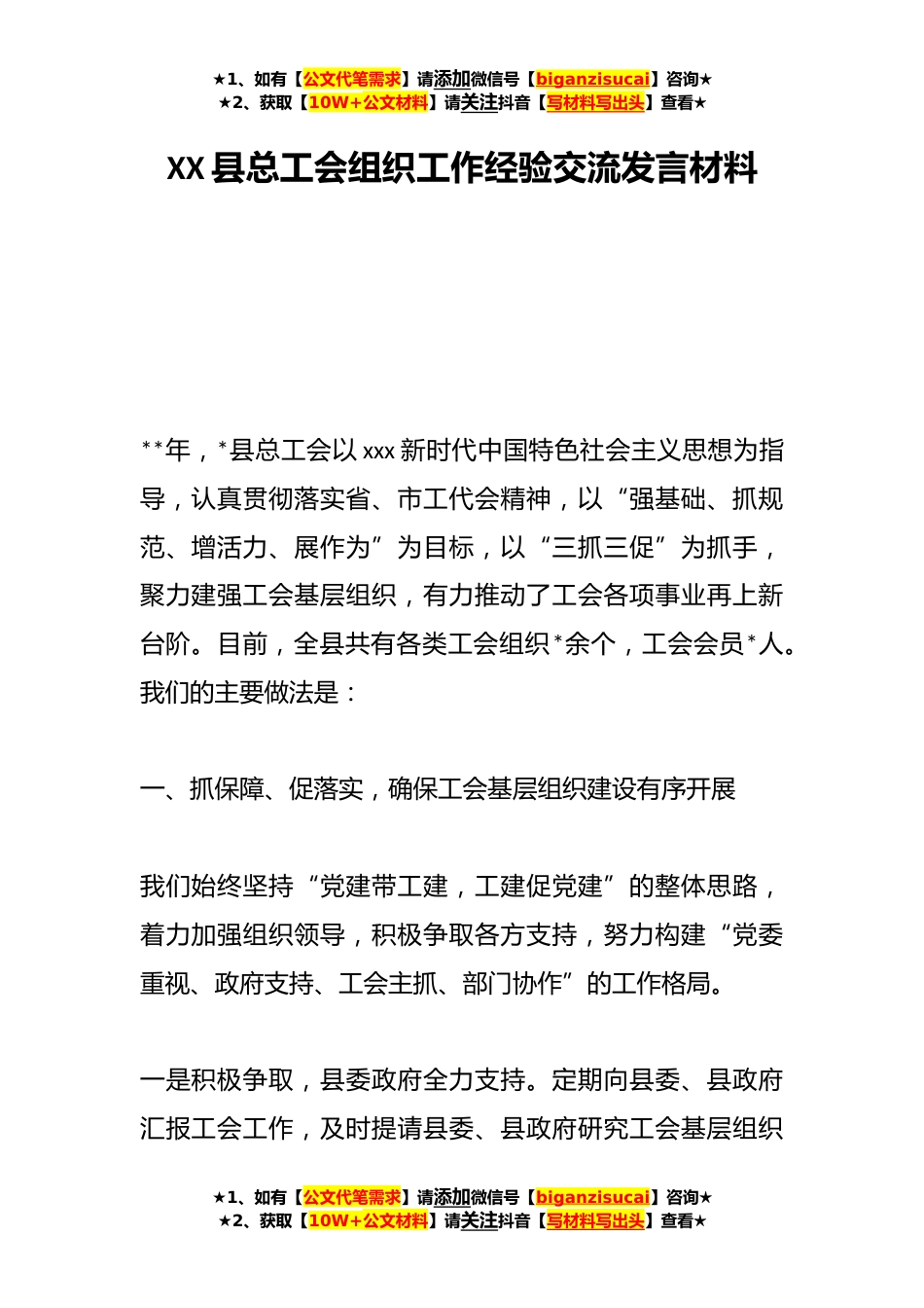 ★1、如有【公文代笔需求】请添加微信号【biganzisucai】咨询★★2、获取【10W+公文材料】请关注抖音【写材料写出头】查看★XX县总工会组织工作经验交流发言材料**年,*县总工会以xxx新时代中国特色社会主义思想为指导,认真贯彻落实省、市工代会精神,以“强基础、抓规范、增活力、展作为”为目标,以“三抓三促”为抓手,聚力建强工会基层组织,有力推动了工会各项事业再上新台阶。目前,全县共有各类工会组织*余个,工会会员*人。我们的主要做法是:一、抓保障、促落实,确保工会基层组织建设有序开展我们始终坚持“党建带工建,工建促党建”的整体思路,着力加强组织领导,积极争取各方支持,努力构建“党委重视、政府支持、工会主抓、部门协作”的工作格局。一是积极争取,县委政府全力支持。定期向县委、县...