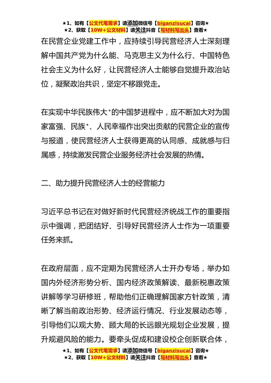 ★1、如有【公文代笔需求】请添加微信号【biganzisucai】咨询★★2、获取【10W+公文材料】请关注抖音【写材料写出头】查看★在推动民营经济营造良好环境工作报告习近平总书记在看望参加政协会议的民建、工商联界委员时强调,党中央始终坚持“两个毫不动摇”“三个没有变”,始终把民营企业和民营企业家当作自己人。“自己人”这个理念的提出,给民营企业和民营企业家吃了一颗“定心丸”。要实现民营经济健康发展、高质量发展,必须深入贯彻习近平总书记重要讲话精神,引导培养民营经济人士健康成长,为“自己人”创造“优环境”,让“自己人”坚定“一条心”。一、不断巩固和扩*时代党和民营经济人士的政治共识在巩固政治思想建设中,应不断加强对民营经济人士的理想信念教育,鼓励他们学习党史,接受红色文化熏陶...