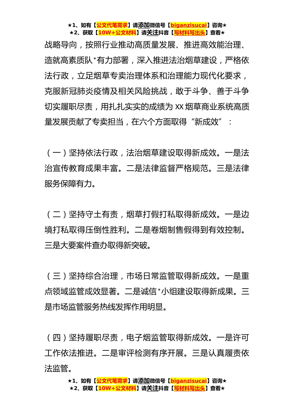 ★1、如有【公文代笔需求】请添加微信号【biganzisucai】咨询★★2、获取【10W+公文材料】请关注抖音【写材料写出头】查看★**年在XX区烟草专卖管理工作会议上的讲话同志们:这次全区烟草专卖管理工作会议的主要任务是:坚持以习近平新时代中国特色社会主义思想为指导,全面贯彻党的XX大精神,认真落实**年全国烟草工作会议和全区烟草商业系统工作会议精神,总结**年专卖管理工作,分析面临的形势任务,部署**年重点工作。一、**年专卖管理工作成效**年,在国家局、区局(公司)党组的正确领导下,全区各级专卖管理部门坚持以习近平新时代中国特色社会主义思想为指导,认真贯彻落实全国烟草专卖管理工作会议和全区烟草商业系统工作会议精神,牢牢把握“三新一高”★1、如有【公文代笔需求】请添加微信号【biganzis...