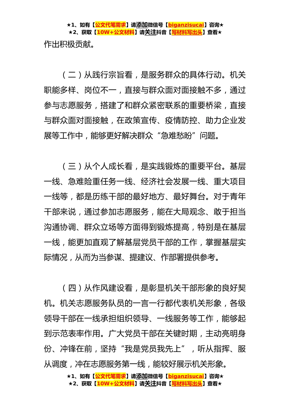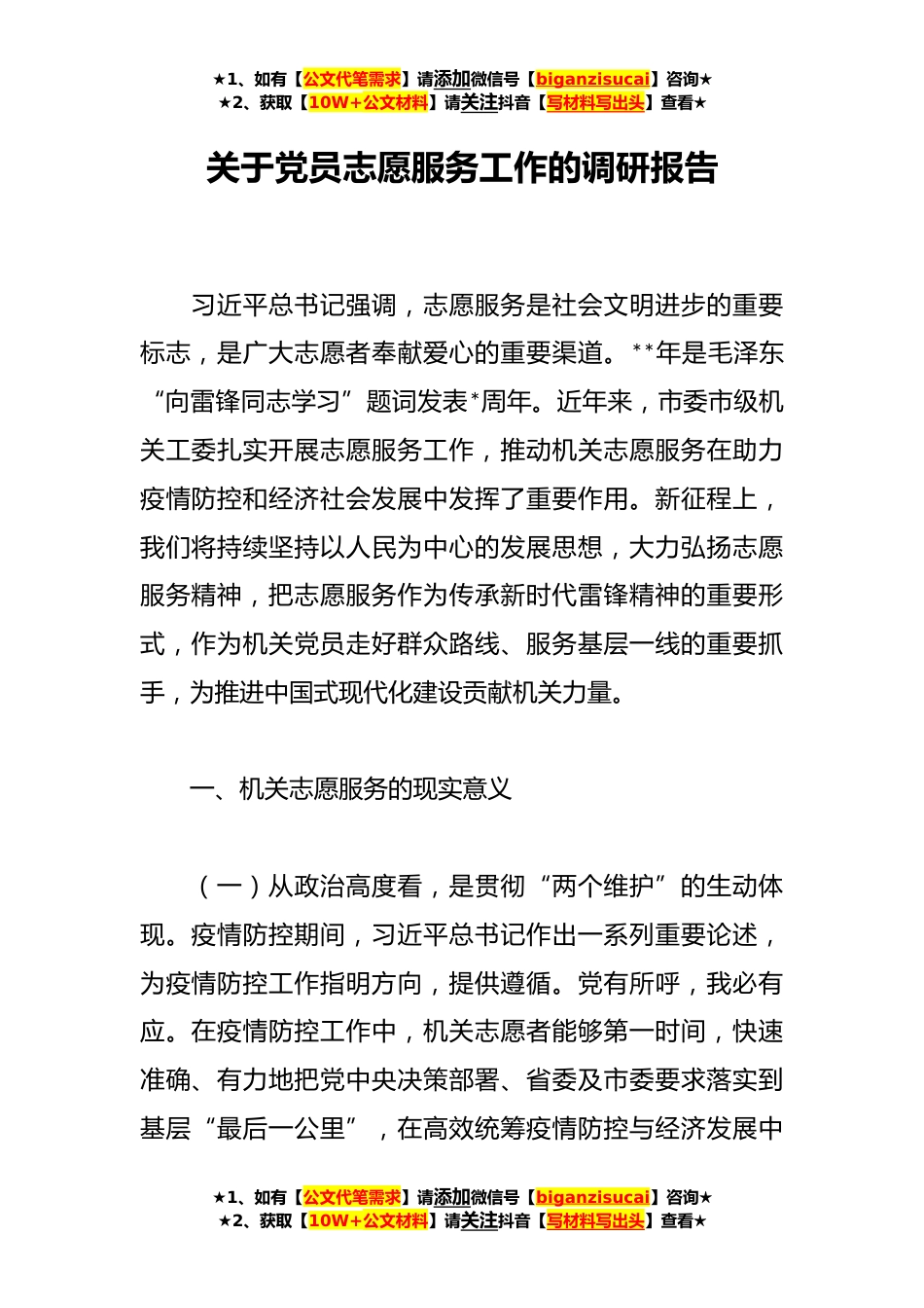 ★1、如有【公文代笔需求】请添加微信号【biganzisucai】咨询★★2、获取【10W+公文材料】请关注抖音【写材料写出头】查看★关于党员志愿服务工作的调研报告习近平总书记强调,志愿服务是社会文明进步的重要标志,是广大志愿者奉献爱心的重要渠道。**年是毛泽东“向雷锋同志学习”题词发表*周年。近年来,市委市级机关工委扎实开展志愿服务工作,推动机关志愿服务在助力疫情防控和经济社会发展中发挥了重要作用。新征程上,我们将持续坚持以人民为中心的发展思想,大力弘扬志愿服务精神,把志愿服务作为传承新时代雷锋精神的重要形式,作为机关党员走好群众路线、服务基层一线的重要抓手,为推进中国式现代化建设贡献机关力量。一、机关志愿服务的现实意义(一)从政治高度看,是贯彻“两个维护”的生动体现。疫情...
