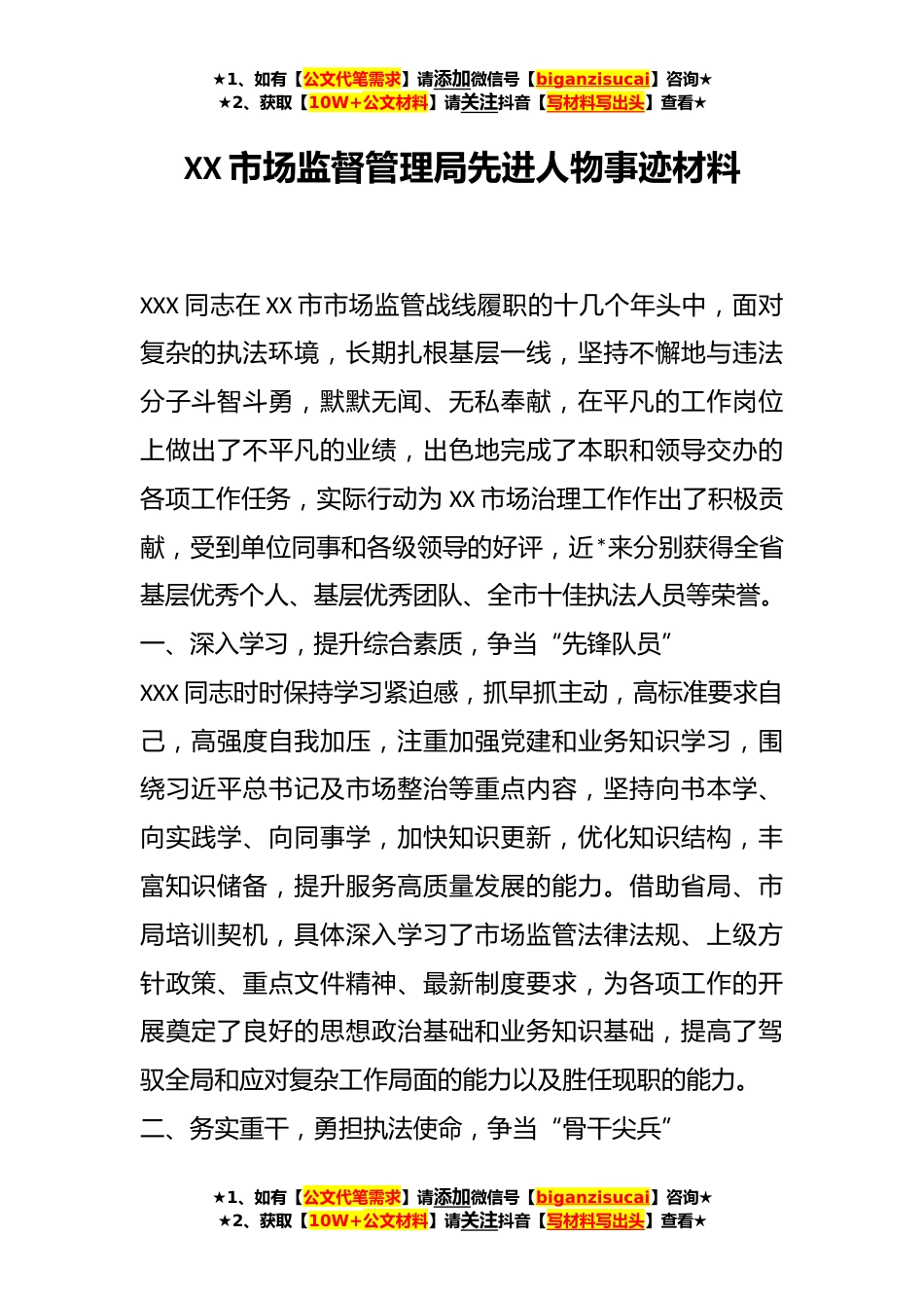 ★1、如有【公文代笔需求】请添加微信号【biganzisucai】咨询★★2、获取【10W+公文材料】请关注抖音【写材料写出头】查看★XX市场监督管理局先进人物事迹材料XXX同志在XX市市场监管战线履职的十几个年头中,面对复杂的执法环境,长期扎根基层一线,坚持不懈地与违法分子斗智斗勇,默默无闻、无私奉献,在平凡的工作岗位上做出了不平凡的业绩,出色地完成了本职和领导交办的各项工作任务,实际行动为XX市场治理工作作出了积极贡献,受到单位同事和各级领导的好评,近*来分别获得全省基层优秀个人、基层优秀团队、全市十佳执法人员等荣誉。一、深入学习,提升综合素质,争当“先锋队员”XXX同志时时保持学习紧迫感,抓早抓主动,高标准要求自己,高强度自我加压,注重加强党建和业务知识学习,围绕习近平总书记及市...