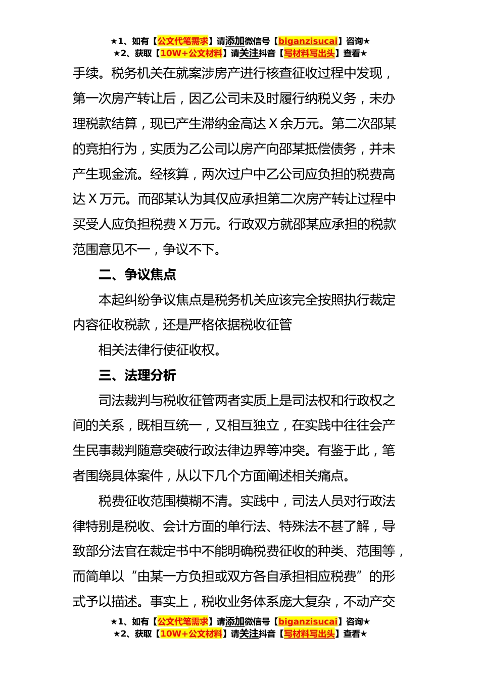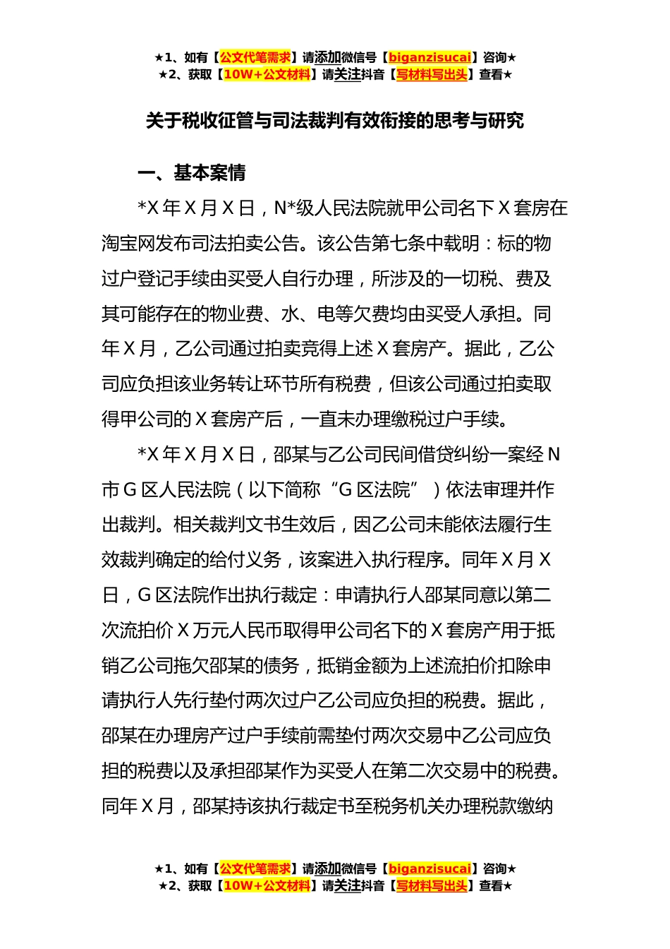 ★1、如有【公文代笔需求】请添加微信号【biganzisucai】咨询★★2、获取【10W+公文材料】请关注抖音【写材料写出头】查看★关于税收征管与司法裁判有效衔接的思考与研究一、基本案情*X年X月X日,N*级人民法院就甲公司名下X套房在淘宝网发布司法拍卖公告。该公告第七条中载明:标的物过户登记手续由买受人自行办理,所涉及的一切税、费及其可能存在的物业费、水、电等欠费均由买受人承担。同年X月,乙公司通过拍卖竞得上述X套房产。据此,乙公司应负担该业务转让环节所有税费,但该公司通过拍卖取得甲公司的X套房产后,一直未办理缴税过户手续。*X年X月X日,邵某与乙公司民间借贷纠纷一案经N市G区人民法院(以下简称“G区法院”)依法审理并作出裁判。相关裁判文书生效后,因乙公司未能依法履行生效裁判确定的给付...