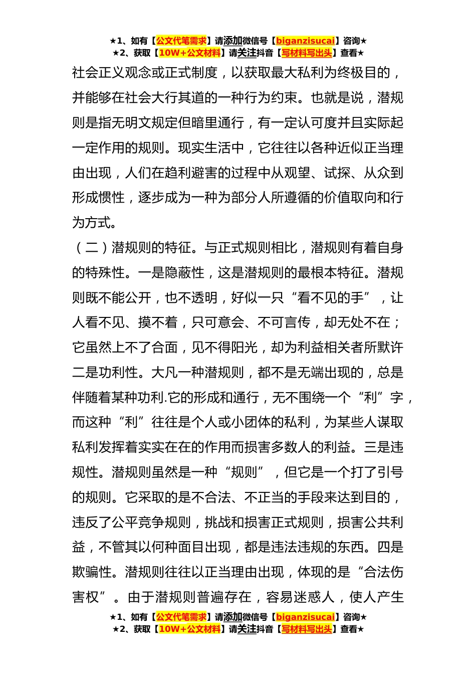 ★1、如有【公文代笔需求】请添加微信号【biganzisucai】咨询★★2、获取【10W+公文材料】请关注抖音【写材料写出头】查看★廉政党课:稳住压舱石破除潜规则在**的文庙内,矗立着一块平常无奇的石头。相传,三国时期吴人*从郁林太守卸任时,全部家当不满一船,船吃水太浅无法航行,只好搬来一块大石头压住船舱,才得以航行。后来,有人把这块石头留了下来,取名“廉石”,向后人昭示*两袖清风、廉洁奉公.船上有廉石,可以稳定船身、乘风破浪,心中有廉石,就可以激浊扬清、抵御不正之风今天,我以《稳住压舱石破除潜规则》为题,从三个方面与大家作以交流。一、如何看待潜规则(一)潜规则的涵义。《现代汉语词典》对“规则”的解释是:规定出来供大家共同遵守的制度或章程。规则具有公开性、强制性、规范性和合法...