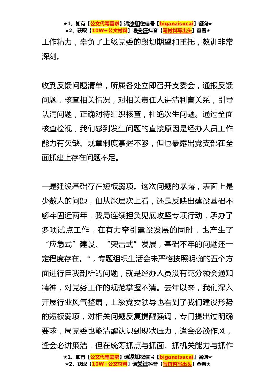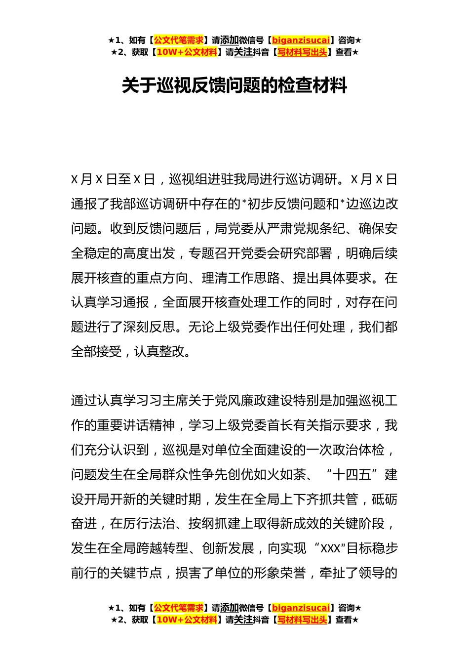 ★1、如有【公文代笔需求】请添加微信号【biganzisucai】咨询★★2、获取【10W+公文材料】请关注抖音【写材料写出头】查看★关于巡视反馈问题的检查材料X月X日至X日,巡视组进驻我局进行巡访调研。X月X日通报了我部巡访调研中存在的*初步反馈问题和*边巡边改问题。收到反馈问题后,局党委从严肃党规条纪、确保安全稳定的高度出发,专题召开党委会研究部署,明确后续展开核查的重点方向、理清工作思路、提出具体要求。在认真学习通报,全面展开核查处理工作的同时,对存在问题进行了深刻反思。无论上级党委作出任何处理,我们都全部接受,认真整改。通过认真学习习主席关于党风廉政建设特别是加强巡视工作的重要讲话精神,学习上级党委首长有关指示要求,我们充分认识到,巡视是对单位全面建设的一次政治体检,问题...