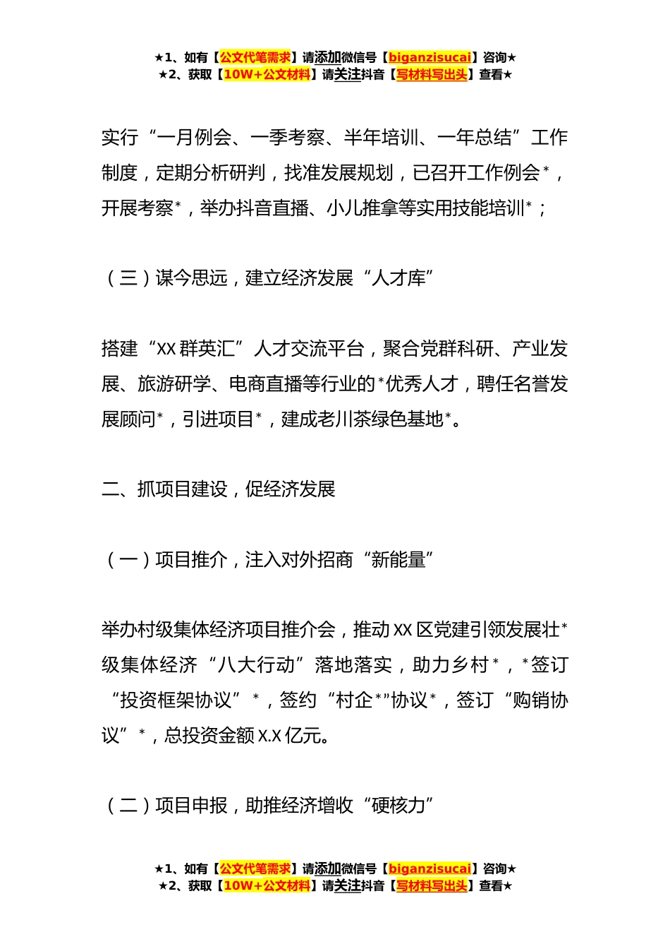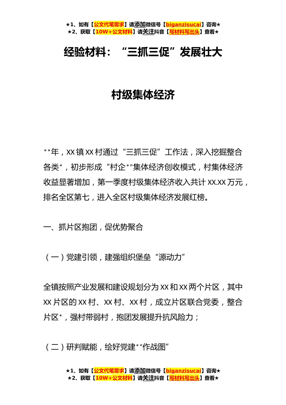 ★1、如有【公文代笔需求】请添加微信号【biganzisucai】咨询★★2、获取【10W+公文材料】请关注抖音【写材料写出头】查看★经验材料:“三抓三促”发展壮大村级集体经济**年,XX镇XX村通过“三抓三促”工作法,深入挖掘整合各类*,初步形成“村企*”集体经济创收模式,村集体经济收益显著增加,第一季度村级集体经济收入共计XX.XX万元,排名全区第七,进入全区村级集体经济发展红榜。一、抓片区抱团,促优势聚合(一)党建引领,建强组织堡垒“源动力”全镇按照产业发展和建设规划分为XX和XX两个片区,其中XX片区的XX村、XX村、XX村,成立片区联合党委,整合片区*,强村带弱村,抱团发展提升抗风险力;(二)研判赋能,绘好党建*“作战图”★1、如有【公文代笔需求】请添加微信号【biganzisucai】咨询★★2、获取...