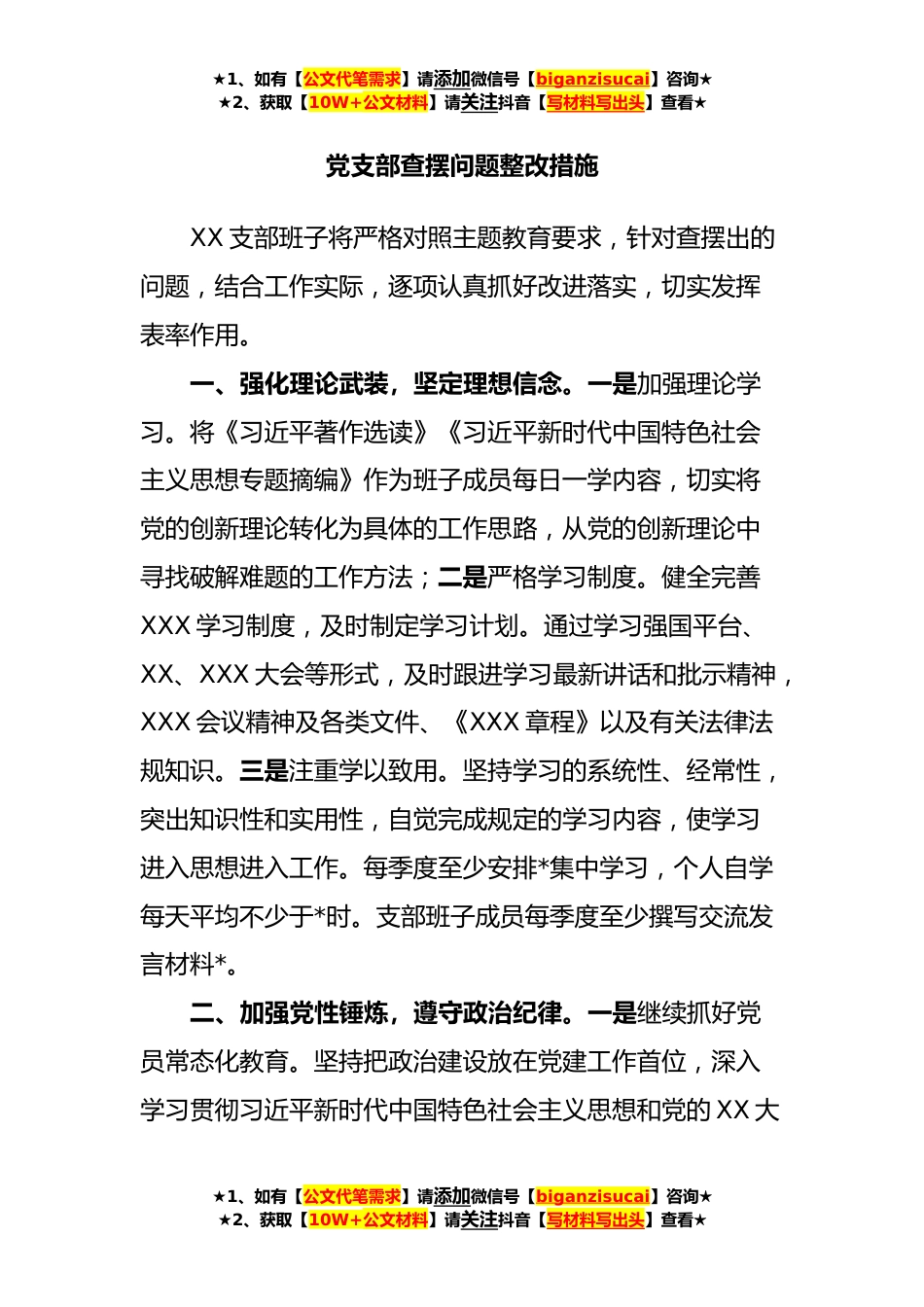 ★1、如有【公文代笔需求】请添加微信号【biganzisucai】咨询★★2、获取【10W+公文材料】请关注抖音【写材料写出头】查看★党支部查摆问题整改措施XX支部班子将严格对照主题教育要求,针对查摆出的问题,结合工作实际,逐项认真抓好改进落实,切实发挥表率作用。一、强化理论武装,坚定理想信念。一是加强理论学习。将《习近平著作选读》《习近平新时代中国特色社会主义思想专题摘编》作为班子成员每日一学内容,切实将党的创新理论转化为具体的工作思路,从党的创新理论中寻找破解难题的工作方法;二是严格学习制度。健全完善XXX学习制度,及时制定学习计划。通过学习强国平台、XX、XXX大会等形式,及时跟进学习最新讲话和批示精神,XXX会议精神及各类文件、《XXX章程》以及有关法律法规知识。三是注重学以致用...