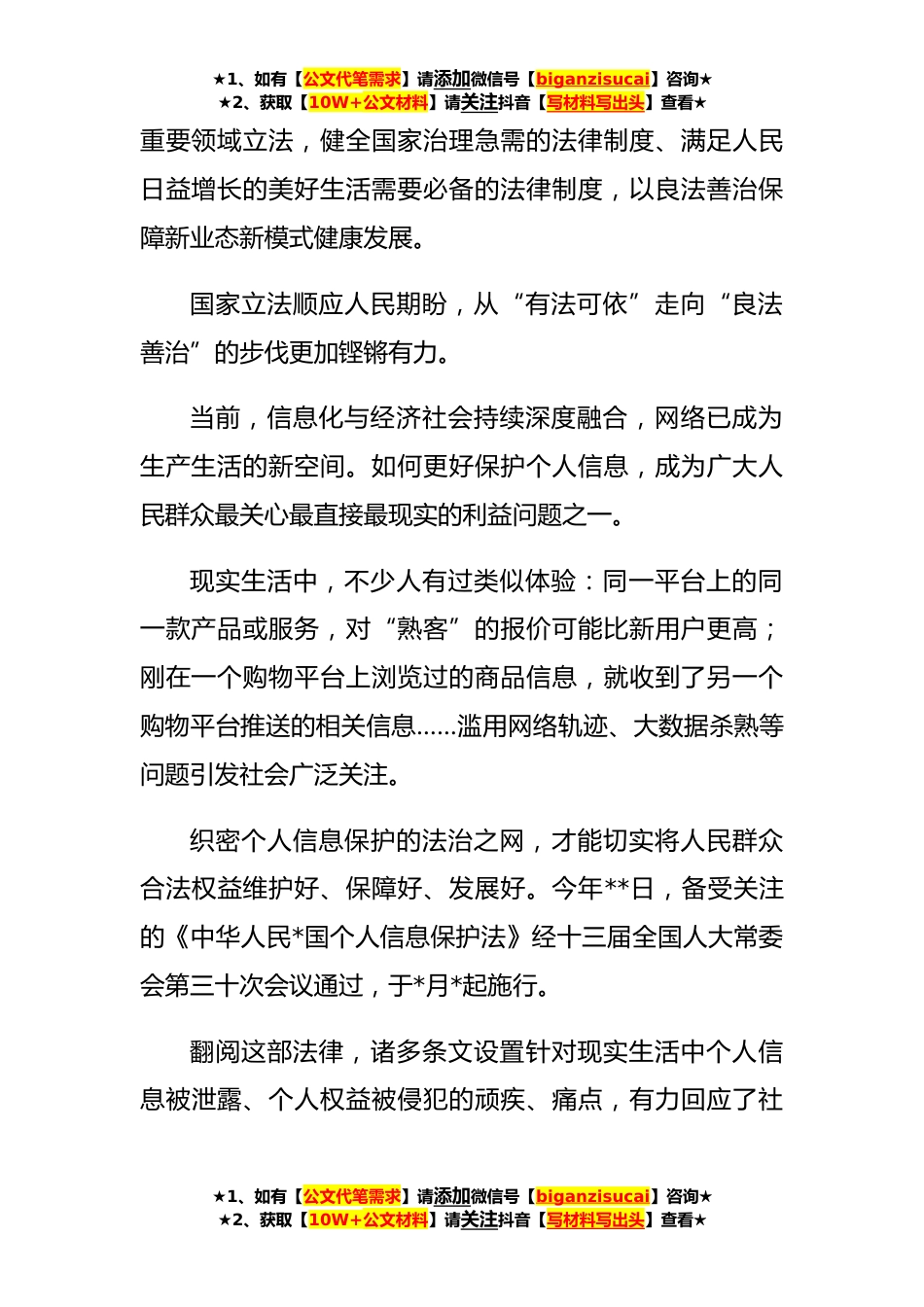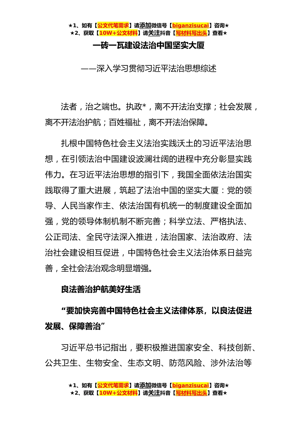 ★1、如有【公文代笔需求】请添加微信号【biganzisucai】咨询★★2、获取【10W+公文材料】请关注抖音【写材料写出头】查看★一砖一瓦建设法治中国坚实大厦——深入学习贯彻习近平法治思想综述法者,治之端也。执政*,离不开法治支撑;社会发展,离不开法治护航;百姓福祉,离不开法治保障。扎根中国特色社会主义法治实践沃土的习近平法治思想,在引领法治中国建设波澜壮阔的进程中充分彰显实践伟力。在习近平法治思想的指引下,我国全面依法治国实践取得了重大进展,筑起了法治中国的坚实大厦:党的领导、人民当家作主、依法治国有机统一的制度建设全面加强,党的领导体制机制不断完善;科学立法、严格执法、公正司法、全民守法深入推进,法治国家、法治政府、法治社会建设相互促进,中国特色社会主义法治体系日益...