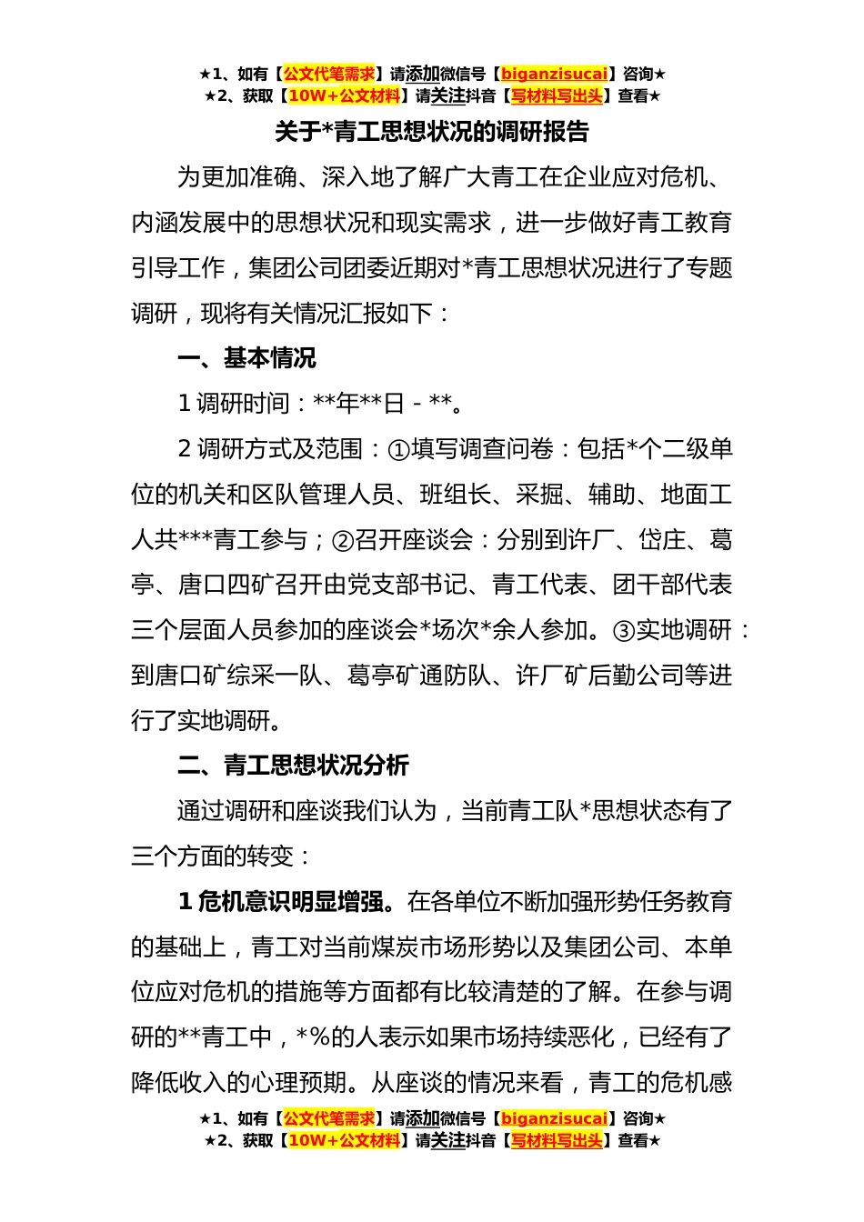 ★1、如有【公文代笔需求】请添加微信号【biganzisucai】咨询★★2、获取【10W+公文材料】请关注抖音【写材料写出头】查看★关于*青工思想状况的调研报告为更加准确、深入地了解广大青工在企业应对危机、内涵发展中的思想状况和现实需求,进一步做好青工教育引导工作,集团公司团委近期对*青工思想状况进行了专题调研,现将有关情况汇报如下:一、基本情况1调研时间:**年**日-**。2调研方式及范围:①填写调查问卷:包括*个二级单位的机关和区队管理人员、班组长、采掘、辅助、地面工人共***青工参与;②召开座谈会:分别到许厂、岱庄、葛亭、唐口四矿召开由党支部书记、青工代表、团干部代表三个层面人员参加的座谈会*场次*余人参加。③实地调研:到唐口矿综采一队、葛亭矿通防队、许厂矿后勤公司等进行了实地...