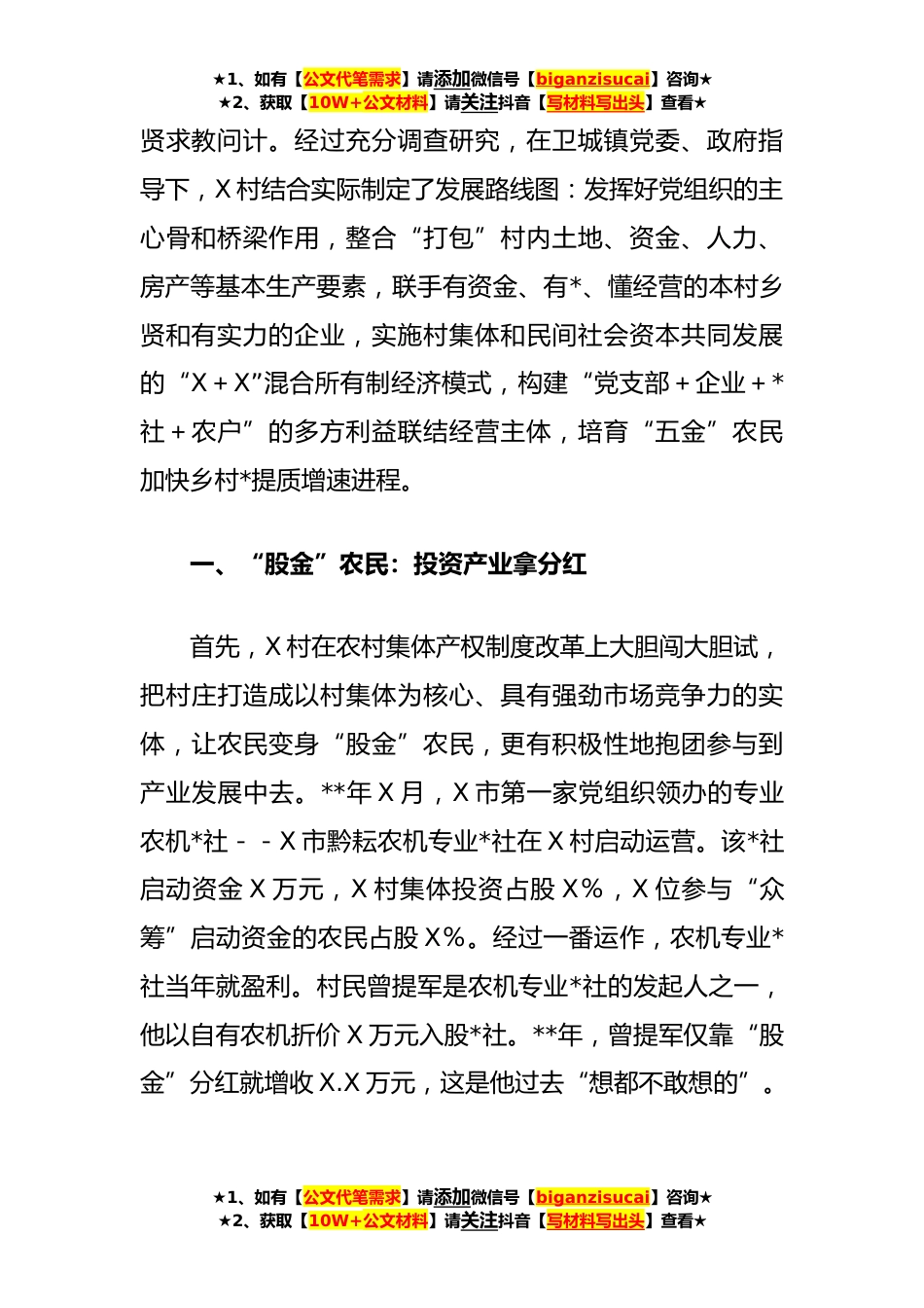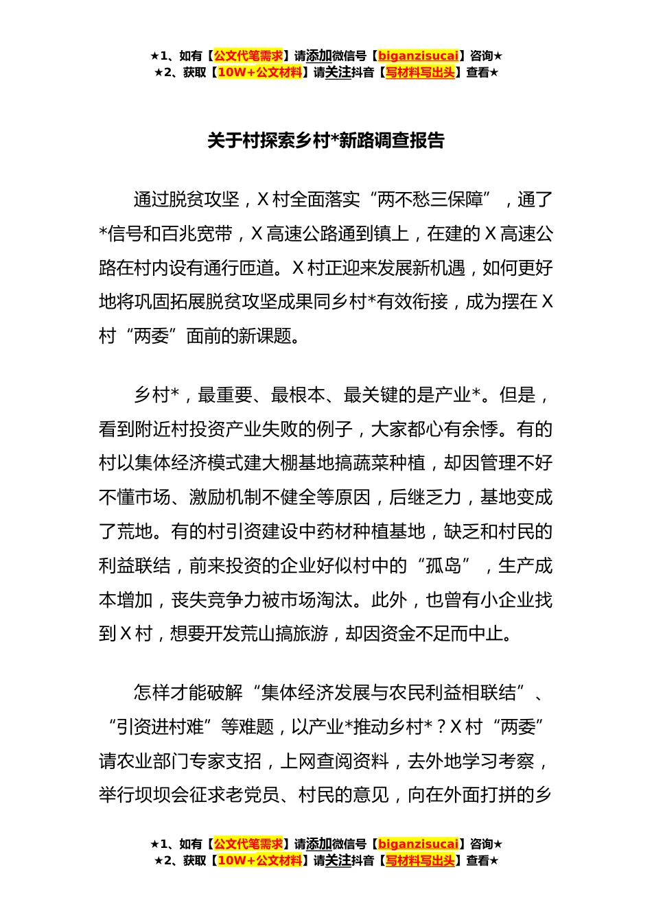 ★1、如有【公文代笔需求】请添加微信号【biganzisucai】咨询★★2、获取【10W+公文材料】请关注抖音【写材料写出头】查看★关于村探索乡村*新路调查报告通过脱贫攻坚,X村全面落实“两不愁三保障”,通了*信号和百兆宽带,X高速公路通到镇上,在建的X高速公路在村内设有通行匝道。X村正迎来发展新机遇,如何更好地将巩固拓展脱贫攻坚成果同乡村*有效衔接,成为摆在X村“两委”面前的新课题。乡村*,最重要、最根本、最关键的是产业*。但是,看到附近村投资产业失败的例子,大家都心有余悸。有的村以集体经济模式建大棚基地搞蔬菜种植,却因管理不好不懂市场、激励机制不健全等原因,后继乏力,基地变成了荒地。有的村引资建设中药材种植基地,缺乏和村民的利益联结,前来投资的企业好似村中的“孤岛”,生产成本...