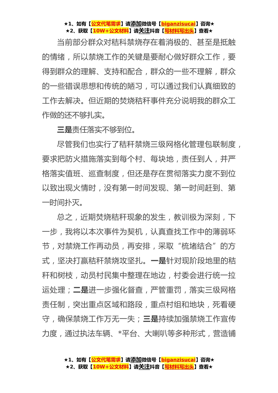 ★1、如有【公文代笔需求】请添加微信号【biganzisucai】咨询★★2、获取【10W+公文材料】请关注抖音【写材料写出头】查看★镇秸秆禁烧检讨书县纪委:近日,X镇境内出现部分地块焚烧秸秆现象,由于焚烧地块地处高速、国道沿线,特别是在中央环保督导组进驻内蒙期间这个重要节点上,出现了这样的问题,导致我们的工作及其被动,造成了一定的负面影响,我作为X镇禁烧工作的分管领导,对此失职工作负有不可推卸责任,特向县纪委作出深刻检讨。尽管今年我镇提前召开秸秆禁烧动员大会,通过成立巡查小组、签订责任状、给予农户秸秆综合利用补贴等多种形式和措施强化秸秆禁烧工作,但工作百密一疏,仍然发生了焚烧秸秆现象,通过深刻反省,认真分析,具体原因有以下几点:一是思想认识还不到位。认为秸秆禁烧工作年年都...