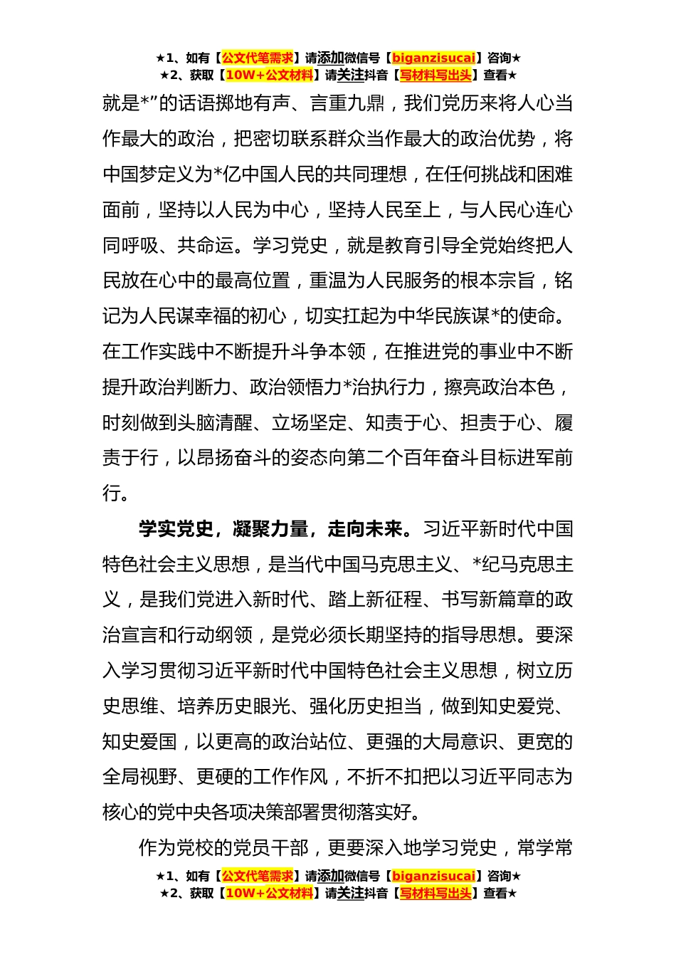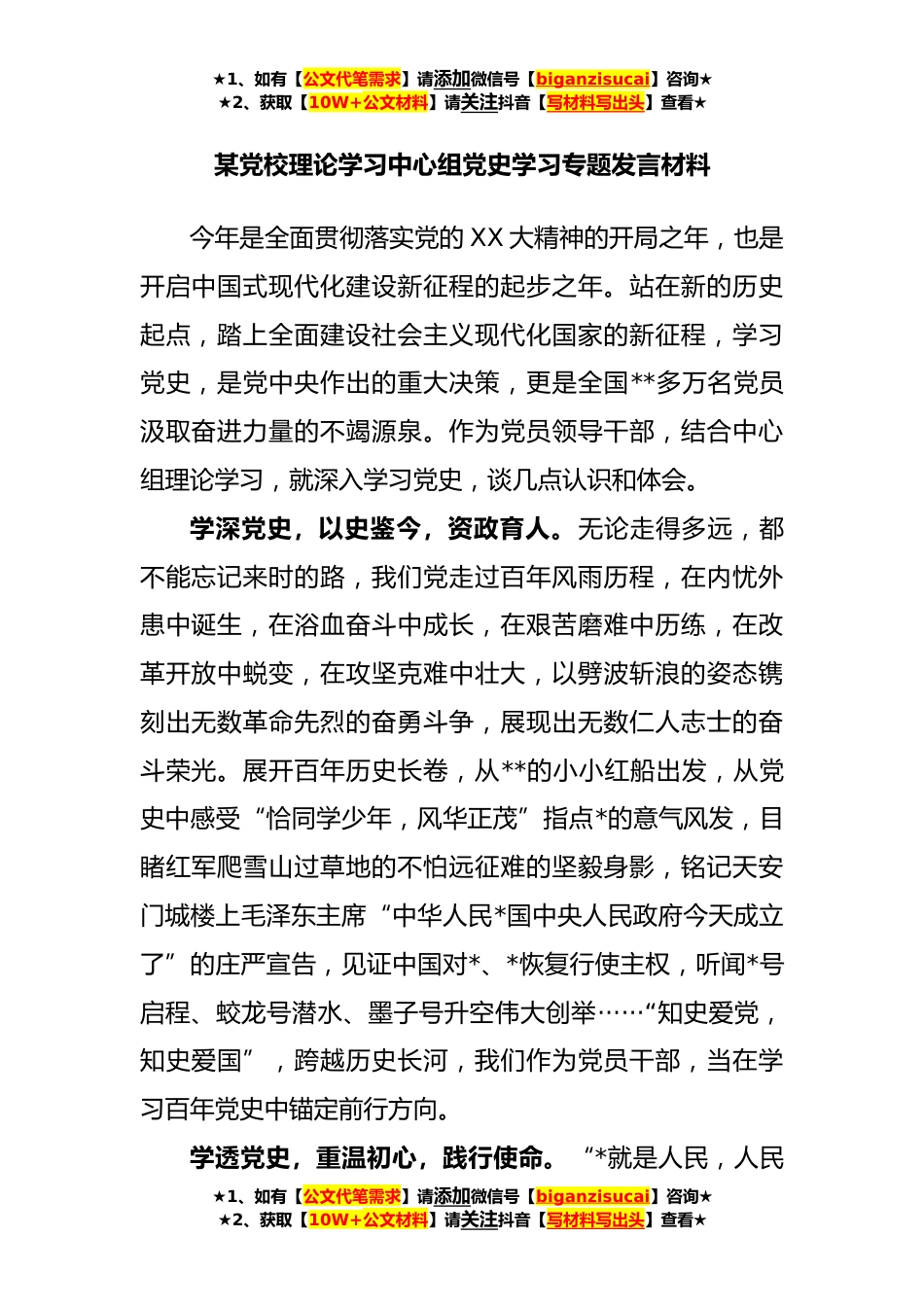 ★1、如有【公文代笔需求】请添加微信号【biganzisucai】咨询★★2、获取【10W+公文材料】请关注抖音【写材料写出头】查看★某党校理论学习中心组党史学习专题发言材料今年是全面贯彻落实党的XX大精神的开局之年,也是开启中国式现代化建设新征程的起步之年。站在新的历史起点,踏上全面建设社会主义现代化国家的新征程,学习党史,是党中央作出的重大决策,更是全国**多万名党员汲取奋进力量的不竭源泉。作为党员领导干部,结合中心组理论学习,就深入学习党史,谈几点认识和体会。学深党史,以史鉴今,资政育人。无论走得多远,都不能忘记来时的路,我们党走过百年风雨历程,在内忧外患中诞生,在浴血奋斗中成长,在艰苦磨难中历练,在改革开放中蜕变,在攻坚克难中壮大,以劈波斩浪的姿态镌刻出无数革命先烈的...