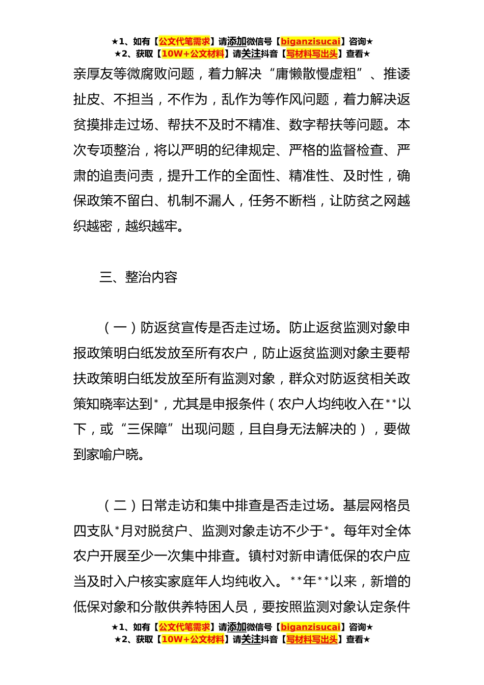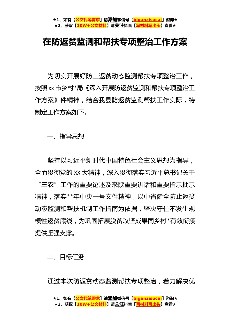 ★1、如有【公文代笔需求】请添加微信号【biganzisucai】咨询★★2、获取【10W+公文材料】请关注抖音【写材料写出头】查看★在防返贫监测和帮扶专项整治工作方案为切实开展好防止返贫动态监测帮扶专项整治工作,按照xx市乡村*局《深入开展防返贫监测和帮扶专项整治工作方案》件精神,结合我县防返贫监测帮扶工作实际,特制定工作方案如下。一、指导思想坚持以习近平新时代中国特色社会主义思想为指导,全而贯彻党的XX大精神,深入贯彻落实习近平总书记关于“三农”工作的重要论述及来陕重要讲话和重要指示批示精神,落实**年中央一号文件精神,以中省健全防止返贫动态监测和帮扶机制工作指南为依据,坚决守住不发生规模性返贫底线,为巩固拓展脱贫攻坚成果同乡村*有效衔接提供坚强支撑。二、目标任务通过本次防返...