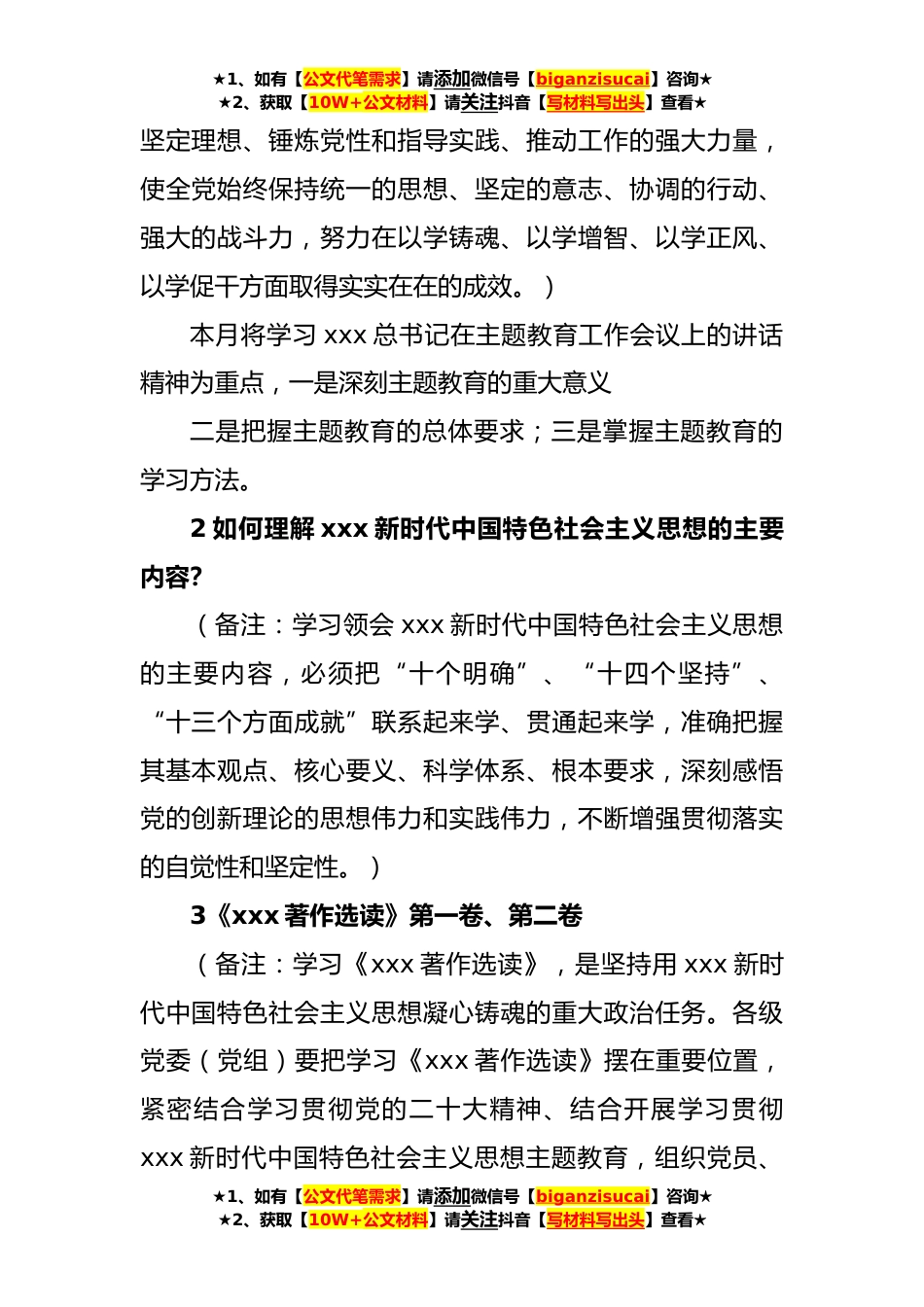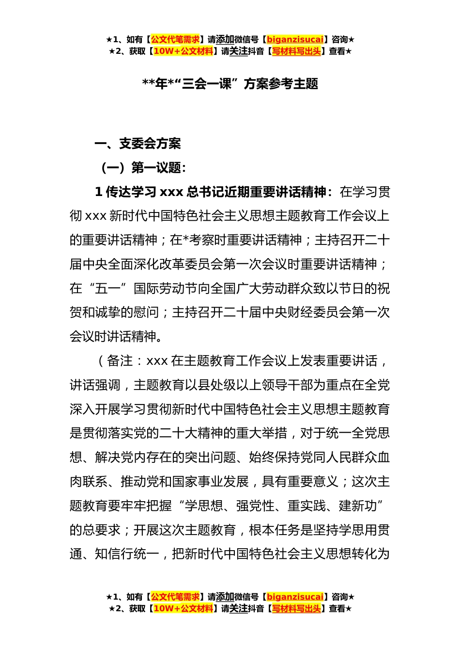 ★1、如有【公文代笔需求】请添加微信号【biganzisucai】咨询★★2、获取【10W+公文材料】请关注抖音【写材料写出头】查看★**年*“三会一课”方案参考主题一、支委会方案(一)第一议题:1传达学习xxx总书记近期重要讲话精神:在学习贯彻xxx新时代中国特色社会主义思想主题教育工作会议上的重要讲话精神;在*考察时重要讲话精神;主持召开二十届中央全面深化改革委员会第一次会议时重要讲话精神;在“五一”国际劳动节向全国广大劳动群众致以节日的祝贺和诚挚的慰问;主持召开二十届中央财经委员会第一次会议时讲话精神。(备注:xxx在主题教育工作会议上发表重要讲话,讲话强调,主题教育以县处级以上领导干部为重点在全党深入开展学习贯彻新时代中国特色社会主义思想主题教育是贯彻落实党的二十大精神的重大举...