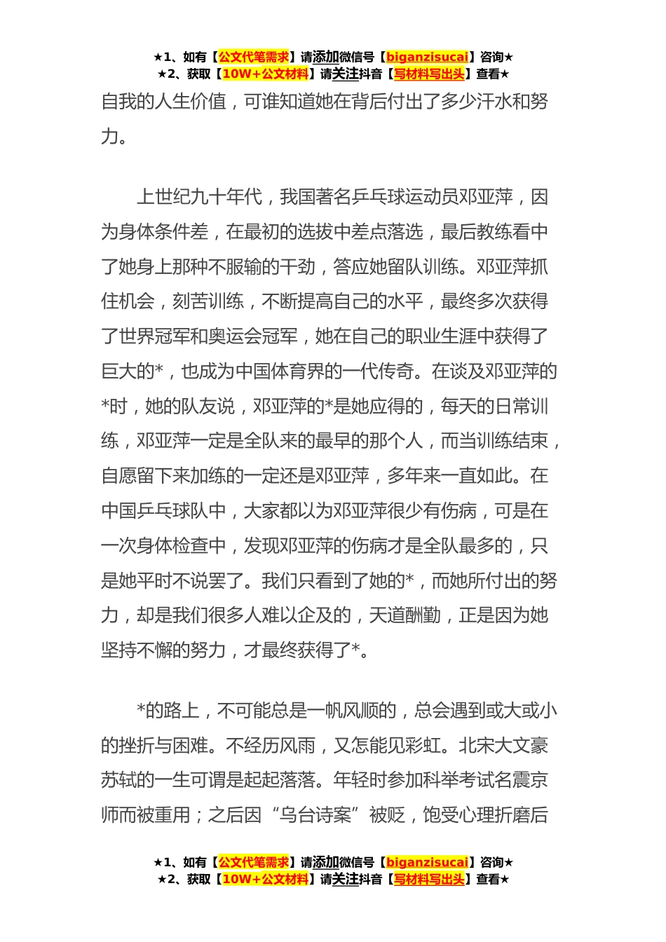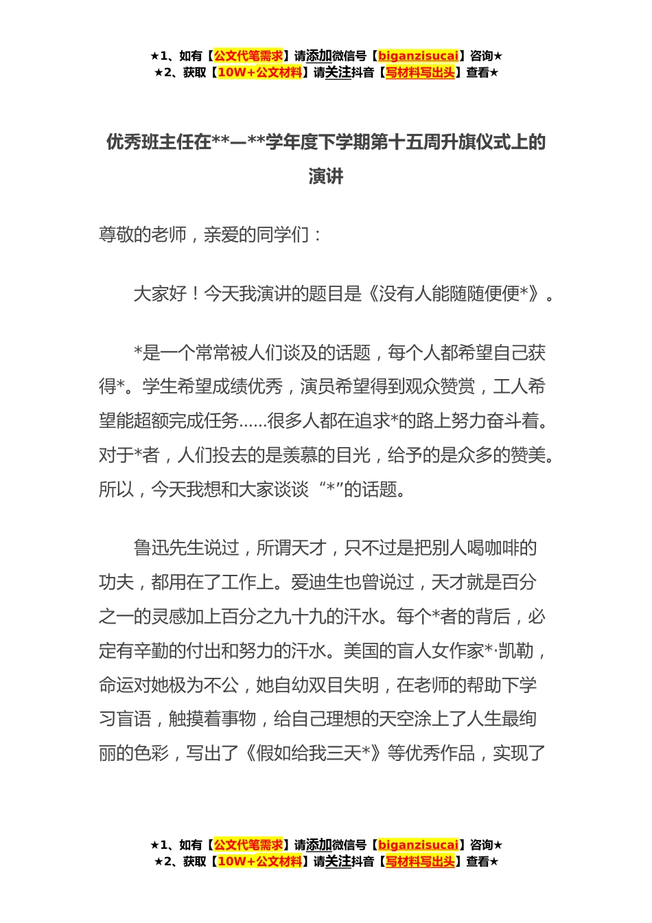 ★1、如有【公文代笔需求】请添加微信号【biganzisucai】咨询★★2、获取【10W+公文材料】请关注抖音【写材料写出头】查看★优秀班主任在**—**学年度下学期第十五周升旗仪式上的演讲尊敬的老师,亲爱的同学们:大家好!今天我演讲的题目是《没有人能随随便便*》。*是一个常常被人们谈及的话题,每个人都希望自己获得*。学生希望成绩优秀,演员希望得到观众赞赏,工人希望能超额完成任务……很多人都在追求*的路上努力奋斗着。对于*者,人们投去的是羡慕的目光,给予的是众多的赞美。所以,今天我想和大家谈谈“*”的话题。鲁迅先生说过,所谓天才,只不过是把别人喝咖啡的功夫,都用在了工作上。爱迪生也曾说过,天才就是百分之一的灵感加上百分之九十九的汗水。每个*者的背后,必定有辛勤的付出和努力的汗水。美...