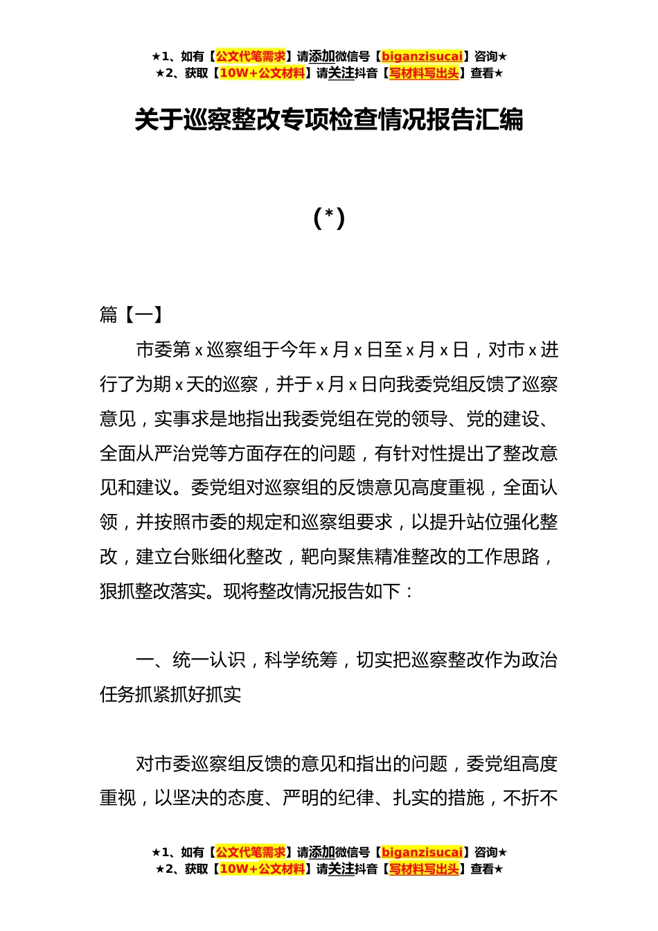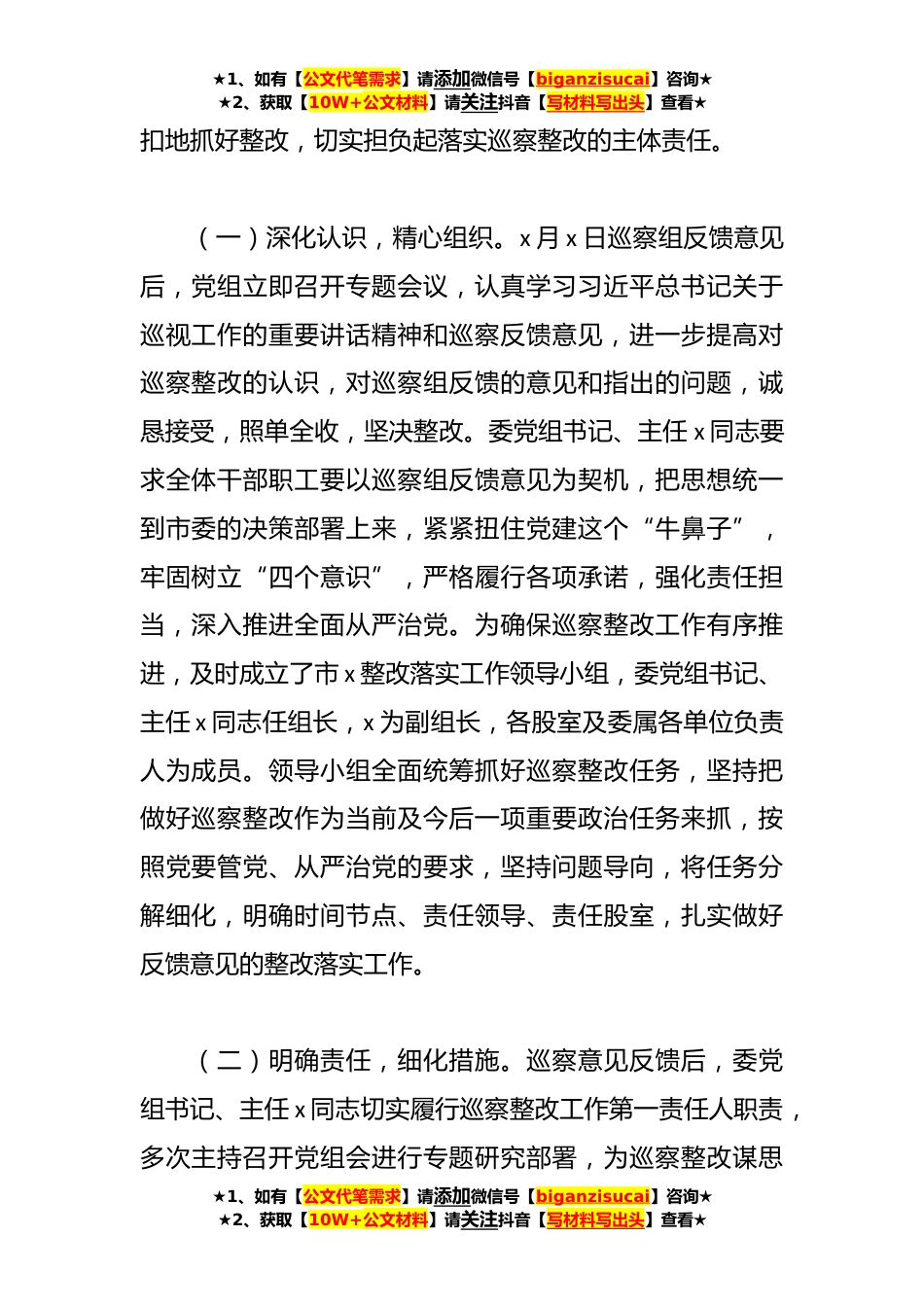 ★1、如有【公文代笔需求】请添加微信号【biganzisucai】咨询★★2、获取【10W+公文材料】请关注抖音【写材料写出头】查看★关于巡察整改专项检查情况报告汇编(*)篇【一】市委第x巡察组于今年x月x日至x月x日,对市x进行了为期x天的巡察,并于x月x日向我委党组反馈了巡察意见,实事求是地指出我委党组在党的领导、党的建设、全面从严治党等方面存在的问题,有针对性提出了整改意见和建议。委党组对巡察组的反馈意见高度重视,全面认领,并按照市委的规定和巡察组要求,以提升站位强化整改,建立台账细化整改,靶向聚焦精准整改的工作思路,狠抓整改落实。现将整改情况报告如下:一、统一认识,科学统筹,切实把巡察整改作为政治任务抓紧抓好抓实对市委巡察组反馈的意见和指出的问题,委党组高度重视,以坚决的态...