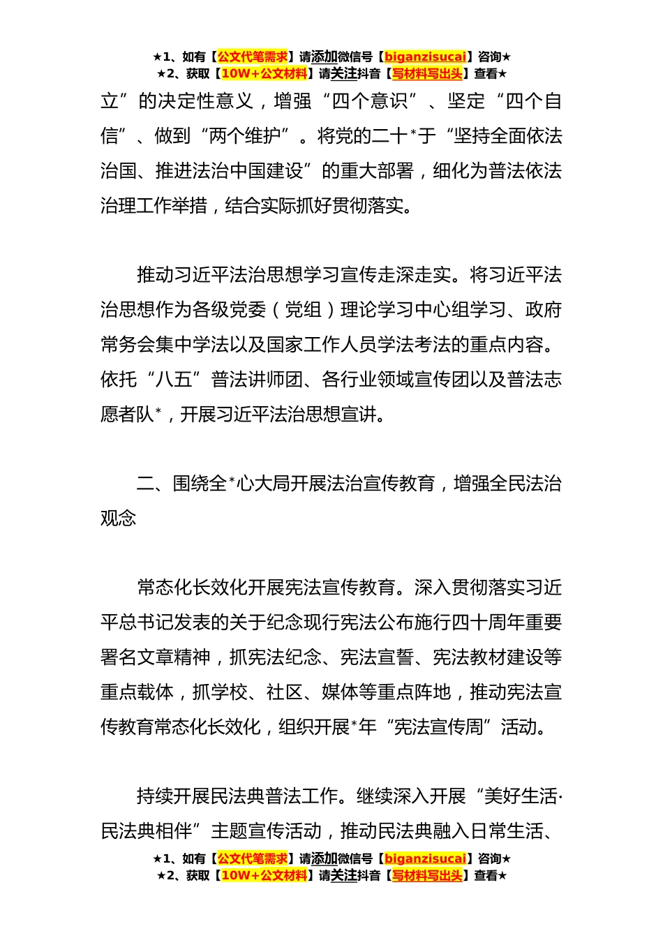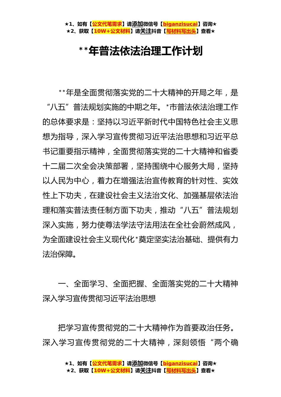 ★1、如有【公文代笔需求】请添加微信号【biganzisucai】咨询★★2、获取【10W+公文材料】请关注抖音【写材料写出头】查看★**年普法依法治理工作计划**年是全面贯彻落实党的二十大精神的开局之年,是“八五”普法规划实施的中期之年。*市普法依法治理工作的总体要求是:坚持以习近平新时代中国特色社会主义思想为指导,深入学习宣传贯彻习近平法治思想和习近平总书记重要指示精神,全面贯彻落实党的二十大精神和省委十二届二次全会决策部署,坚持围绕中心服务大局,坚持以人民为中心,着力在增强法治宣传教育的针对性、实效性上下功夫,在建设社会主义法治文化、加强基层依法治理和落实普法责任制方面下功夫,推动“八五”普法规划深入实施,努力使尊法学法守法用法在全社会蔚然成风,为全面建设社会主义现代化*...