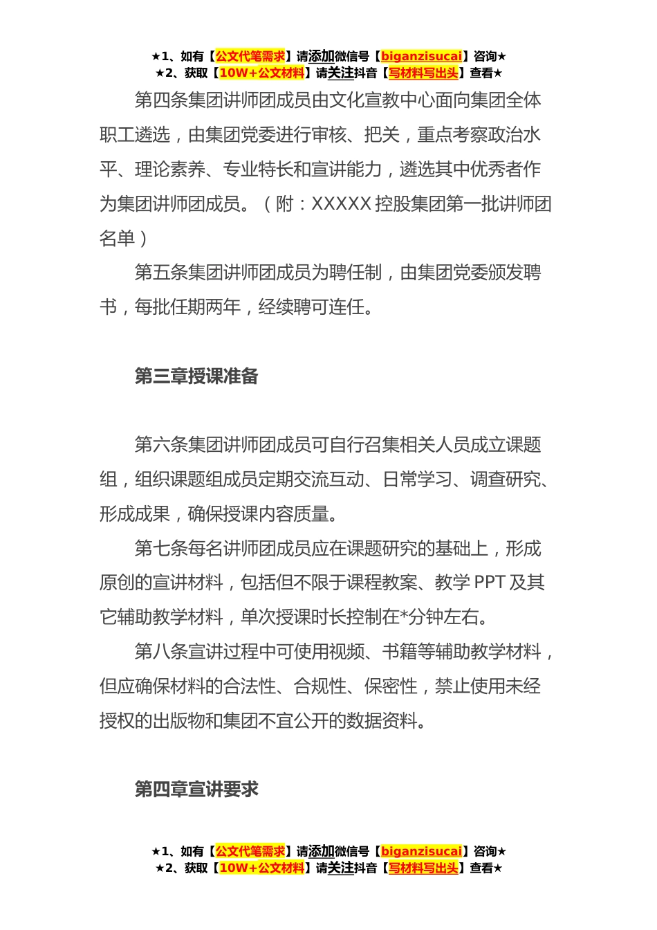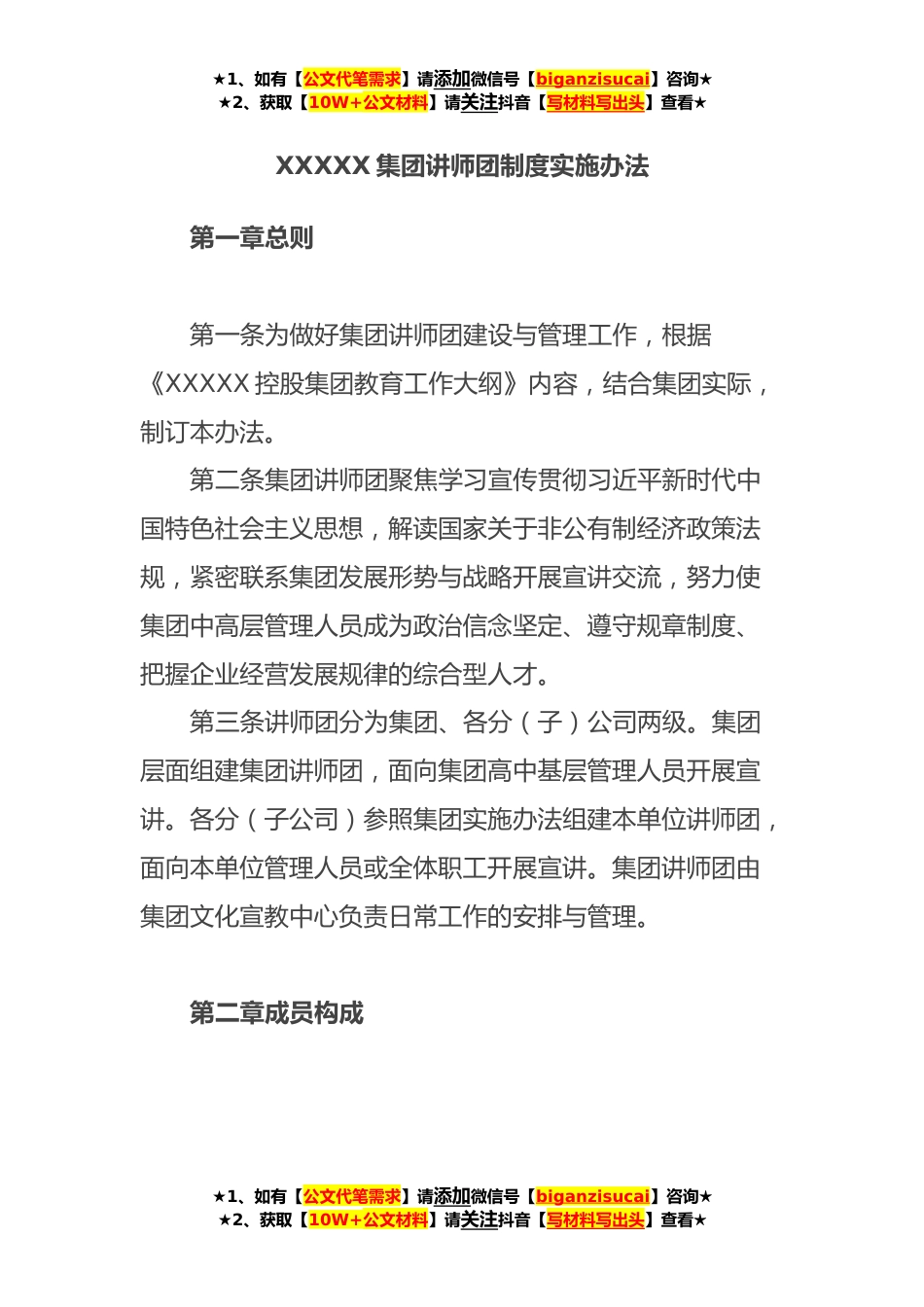 ★1、如有【公文代笔需求】请添加微信号【biganzisucai】咨询★★2、获取【10W+公文材料】请关注抖音【写材料写出头】查看★XXXXX集团讲师团制度实施办法第一章总则第一条为做好集团讲师团建设与管理工作,根据《XXXXX控股集团教育工作大纲》内容,结合集团实际,制订本办法。第二条集团讲师团聚焦学习宣传贯彻习近平新时代中国特色社会主义思想,解读国家关于非公有制经济政策法规,紧密联系集团发展形势与战略开展宣讲交流,努力使集团中高层管理人员成为政治信念坚定、遵守规章制度、把握企业经营发展规律的综合型人才。第三条讲师团分为集团、各分(子)公司两级。集团层面组建集团讲师团,面向集团高中基层管理人员开展宣讲。各分(子公司)参照集团实施办法组建本单位讲师团,面向本单位管理人员或全体职工...