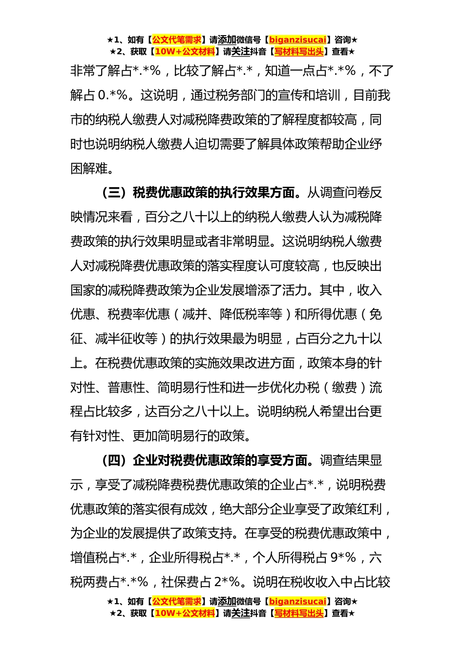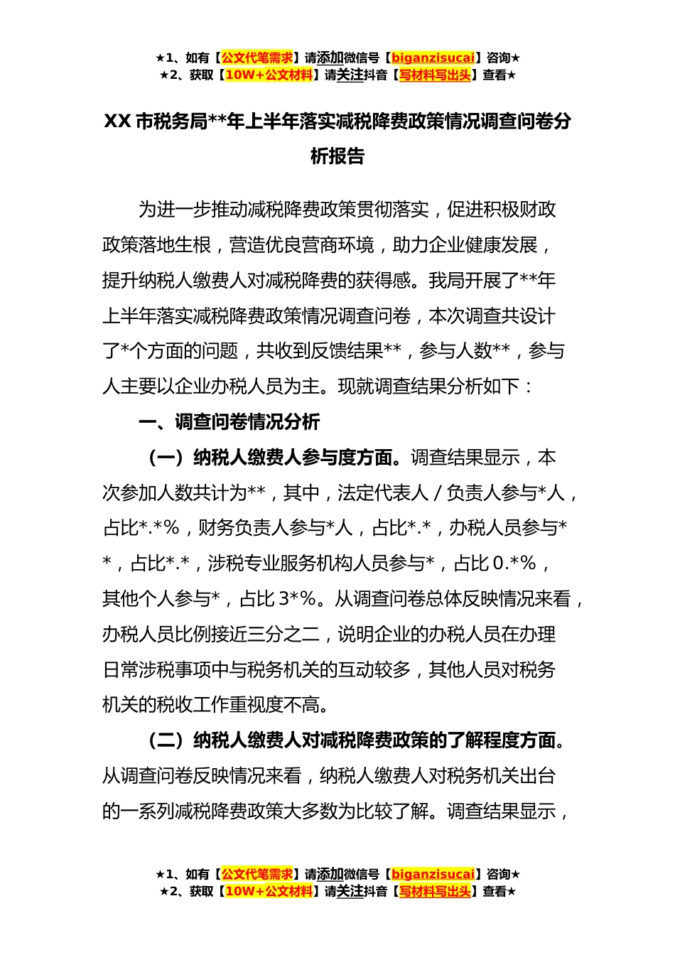 ★1、如有【公文代笔需求】请添加微信号【biganzisucai】咨询★★2、获取【10W+公文材料】请关注抖音【写材料写出头】查看★XX市税务局**年上半年落实减税降费政策情况调查问卷分析报告为进一步推动减税降费政策贯彻落实,促进积极财政政策落地生根,营造优良营商环境,助力企业健康发展,提升纳税人缴费人对减税降费的获得感。我局开展了**年上半年落实减税降费政策情况调查问卷,本次调查共设计了*个方面的问题,共收到反馈结果**,参与人数**,参与人主要以企业办税人员为主。现就调查结果分析如下:一、调查问卷情况分析(一)纳税人缴费人参与度方面。调查结果显示,本次参加人数共计为**,其中,法定代表人/负责人参与*人,占比*.*%,财务负责人参与*人,占比*.*,办税人员参与**,占比*.*,涉税专业服务...