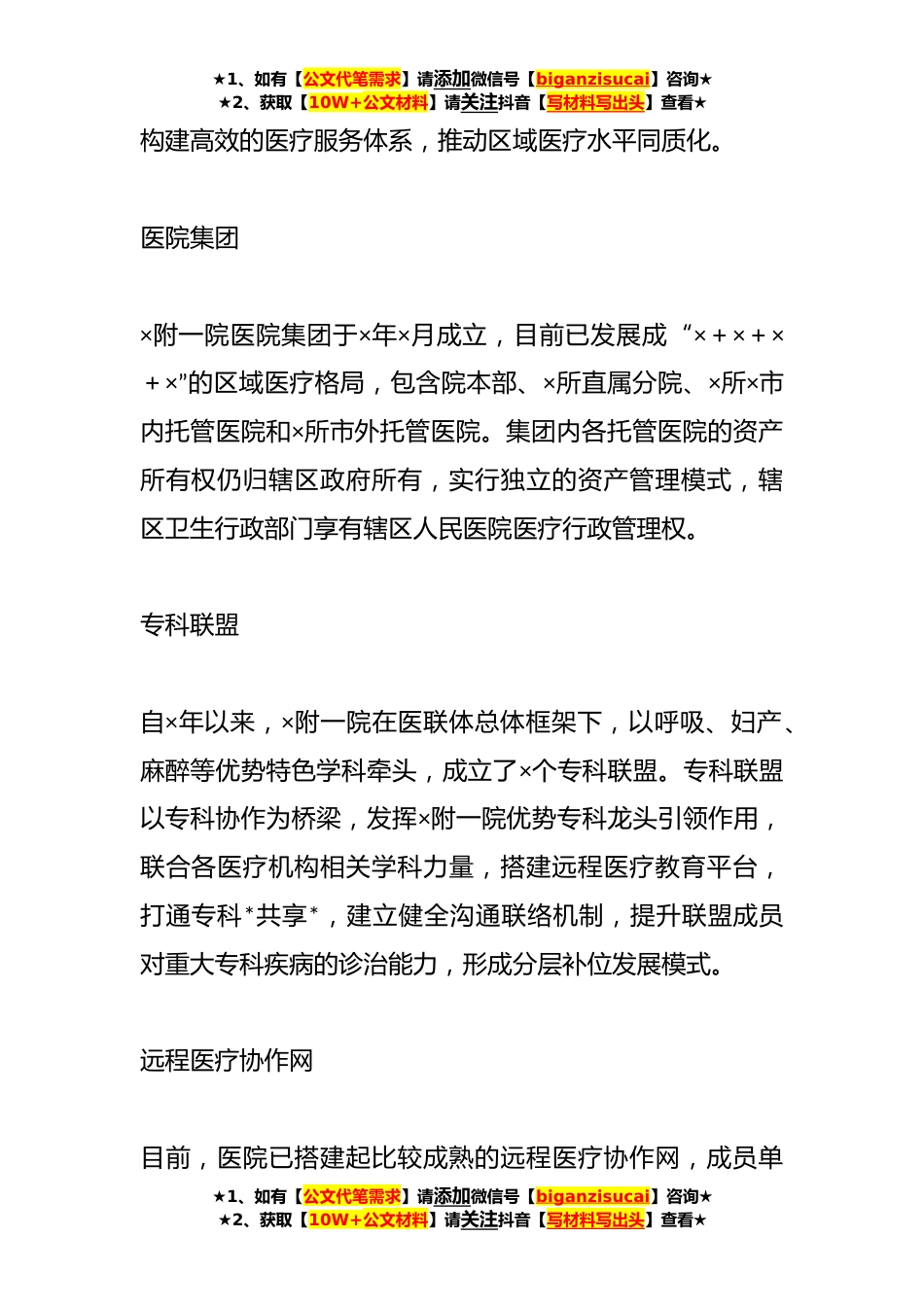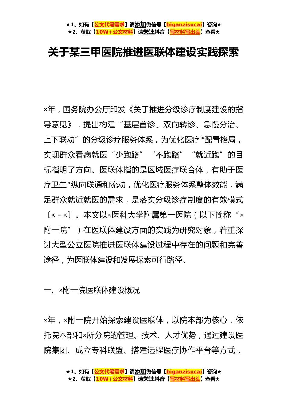 ★1、如有【公文代笔需求】请添加微信号【biganzisucai】咨询★★2、获取【10W+公文材料】请关注抖音【写材料写出头】查看★关于某三甲医院推进医联体建设实践探索×年,国务院办公厅印发《关于推进分级诊疗制度建设的指导意见》,提出构建“基层首诊、双向转诊、急慢分治、上下联动”的分级诊疗服务体系,为优化医疗*配置格局,实现群众看病就医“少跑路”“不跑路”“就近跑”的目标指明了方向。医联体指的是区域医疗联合体,有助于医疗卫生*纵向联通和流动,优化医疗服务体系整体效能,满足群众就近就医的需求,是落实分级诊疗制度的有效模式〔×-×〕。本文以×医科大学附属第一医院(以下简称“×附一院”)在医联体建设方面的实践为研究对象,着重探讨大型公立医院推进医联体建设过程中存在的问题和完善途...