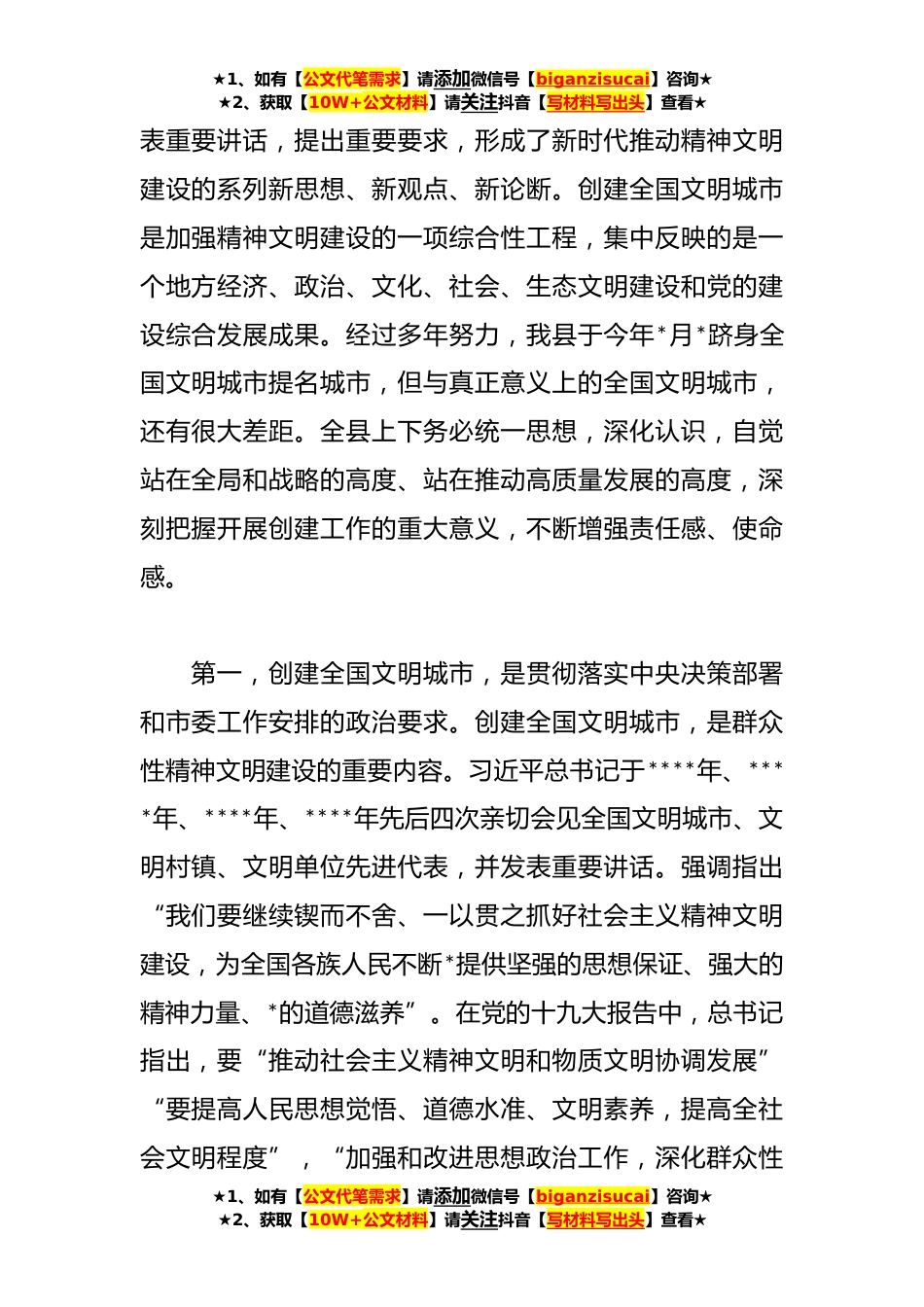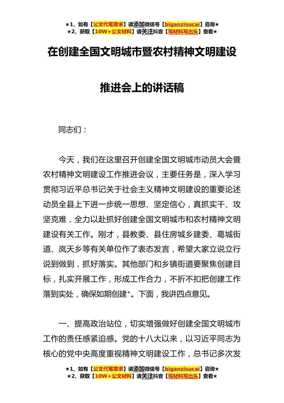 ★1、如有【公文代笔需求】请添加微信号【biganzisucai】咨询★★2、获取【10W+公文材料】请关注抖音【写材料写出头】查看★在创建全国文明城市暨农村精神文明建设推进会上的讲话稿同志们:今天,我们在这里召开创建全国文明城市动员大会暨农村精神文明建设工作推进会议,主要任务是,深入学习贯彻习近平总书记关于社会主义精神文明建设的重要论述动员全县上下进一步统一思想、坚定信心,真抓实干、攻坚克难,全力以赴抓好创建全国文明城市和农村精神文明建设有关工作。刚才,县教委、县住房城乡建委、葛城街道、岚天乡等有关单位作了表态发言,希望大家立说立行说到做到,抓好落实。其他部门和乡镇街道要聚焦创建目标,扎实开展工作,形成工作合力,不折不扣把创建工作落到实处,确保如期创建*。下面,我讲四点意...