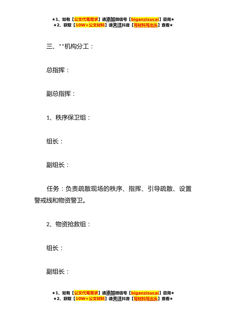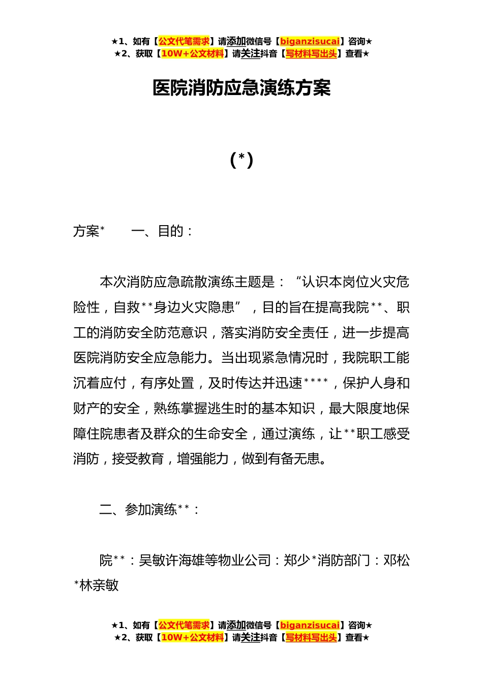 ★1、如有【公文代笔需求】请添加微信号【biganzisucai】咨询★★2、获取【10W+公文材料】请关注抖音【写材料写出头】查看★医院消防应急演练方案(*)方案*一、目的:本次消防应急疏散演练主题是:“认识本岗位火灾危险性,自救**身边火灾隐患”,目的旨在提高我院**、职工的消防安全防范意识,落实消防安全责任,进一步提高医院消防安全应急能力。当出现紧急情况时,我院职工能沉着应付,有序处置,及时传达并迅速****,保护人身和财产的安全,熟练掌握逃生时的基本知识,最大限度地保障住院患者及群众的生命安全,通过演练,让**职工感受消防,接受教育,增强能力,做到有备无患。二、参加演练**:院**:吴敏许海雄等物业公司:郑少*消防部门:邓松*林亲敏★1、如有【公文代笔需求】请添加微信号【biganzisucai...
