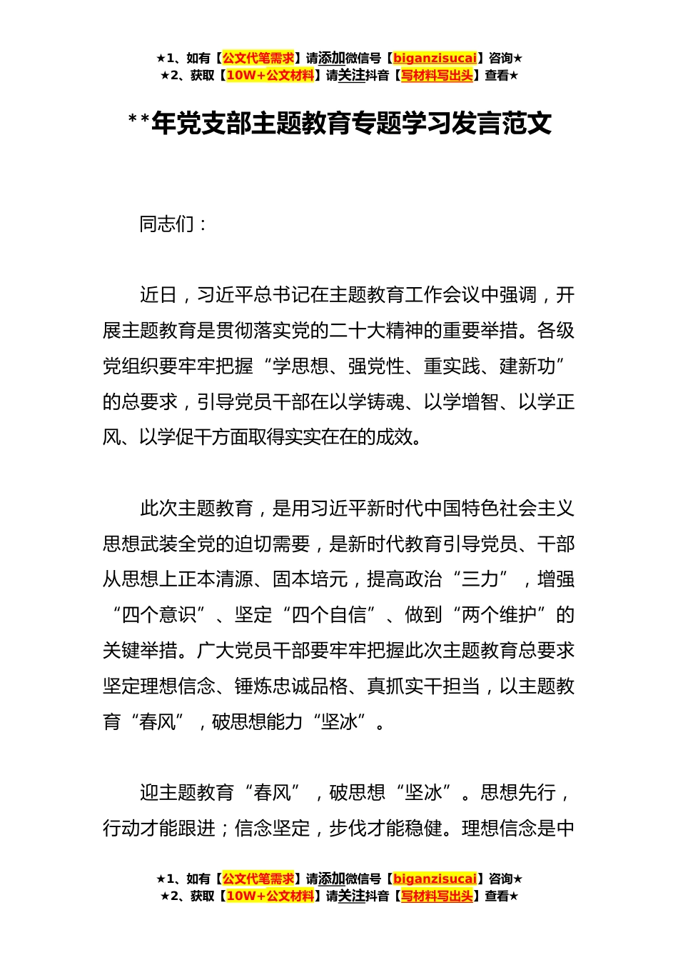 ★1、如有【公文代笔需求】请添加微信号【biganzisucai】咨询★★2、获取【10W+公文材料】请关注抖音【写材料写出头】查看★**年党支部主题教育专题学习发言范文同志们:近日,习近平总书记在主题教育工作会议中强调,开展主题教育是贯彻落实党的二十大精神的重要举措。各级党组织要牢牢把握“学思想、强党性、重实践、建新功”的总要求,引导党员干部在以学铸魂、以学增智、以学正风、以学促干方面取得实实在在的成效。此次主题教育,是用习近平新时代中国特色社会主义思想武装全党的迫切需要,是新时代教育引导党员、干部从思想上正本清源、固本培元,提高政治“三力”,增强“四个意识”、坚定“四个自信”、做到“两个维护”的关键举措。广大党员干部要牢牢把握此次主题教育总要求坚定理想信念、锤炼忠诚品格...