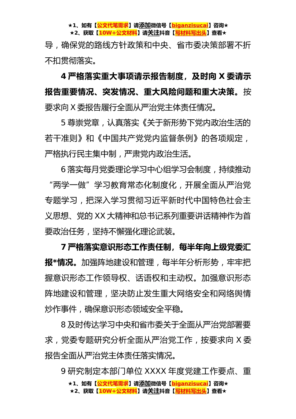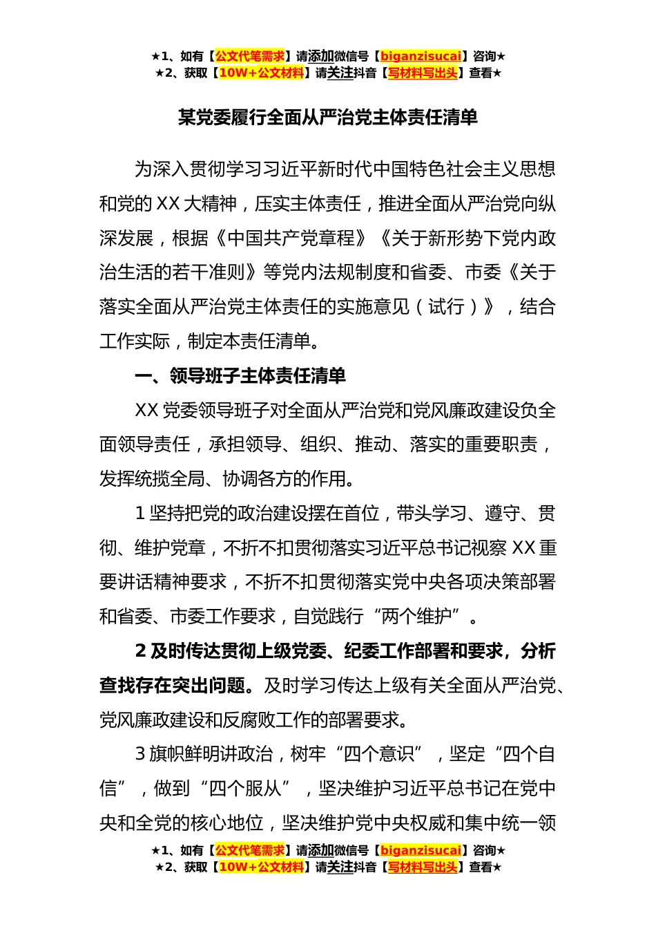 ★1、如有【公文代笔需求】请添加微信号【biganzisucai】咨询★★2、获取【10W+公文材料】请关注抖音【写材料写出头】查看★某党委履行全面从严治党主体责任清单为深入贯彻学习习近平新时代中国特色社会主义思想和党的XX大精神,压实主体责任,推进全面从严治党向纵深发展,根据《中国共产党章程》《关于新形势下党内政治生活的若干准则》等党内法规制度和省委、市委《关于落实全面从严治党主体责任的实施意见(试行)》,结合工作实际,制定本责任清单。一、领导班子主体责任清单XX党委领导班子对全面从严治党和党风廉政建设负全面领导责任,承担领导、组织、推动、落实的重要职责,发挥统揽全局、协调各方的作用。1坚持把党的政治建设摆在首位,带头学习、遵守、贯彻、维护党章,不折不扣贯彻落实习近平总书记视...