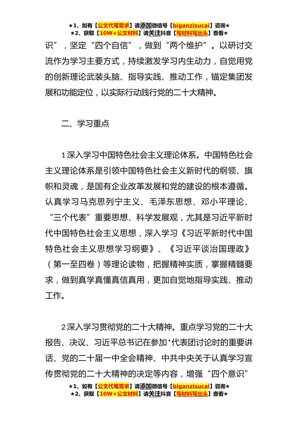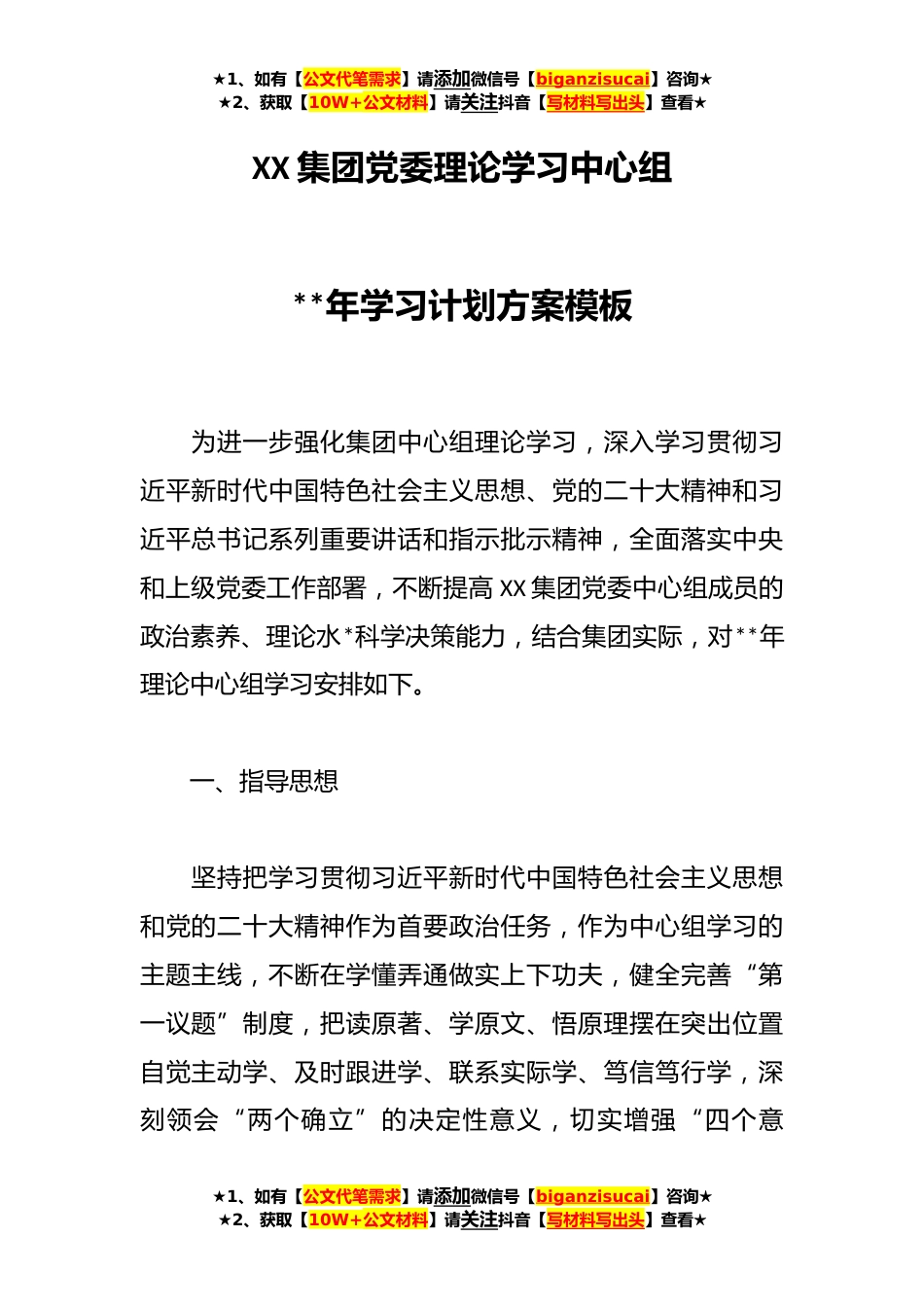 ★1、如有【公文代笔需求】请添加微信号【biganzisucai】咨询★★2、获取【10W+公文材料】请关注抖音【写材料写出头】查看★XX集团党委理论学习中心组**年学习计划方案模板为进一步强化集团中心组理论学习,深入学习贯彻习近平新时代中国特色社会主义思想、党的二十大精神和习近平总书记系列重要讲话和指示批示精神,全面落实中央和上级党委工作部署,不断提高XX集团党委中心组成员的政治素养、理论水*科学决策能力,结合集团实际,对**年理论中心组学习安排如下。一、指导思想坚持把学习贯彻习近平新时代中国特色社会主义思想和党的二十大精神作为首要政治任务,作为中心组学习的主题主线,不断在学懂弄通做实上下功夫,健全完善“第一议题”制度,把读原著、学原文、悟原理摆在突出位置自觉主动学、及时跟进学、...