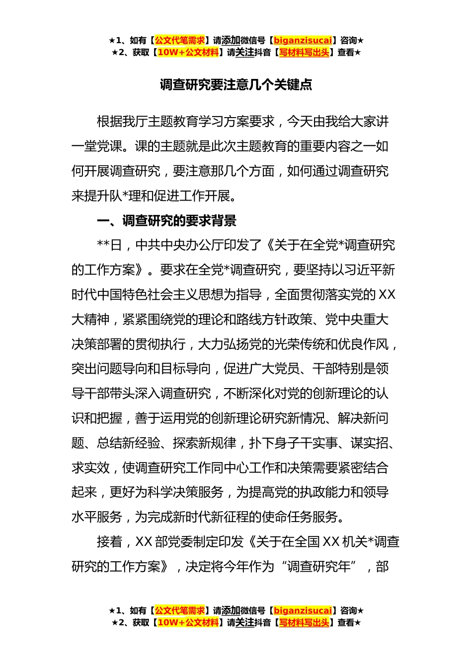 ★1、如有【公文代笔需求】请添加微信号【biganzisucai】咨询★★2、获取【10W+公文材料】请关注抖音【写材料写出头】查看★调查研究要注意几个关键点根据我厅主题教育学习方案要求,今天由我给大家讲一堂党课。课的主题就是此次主题教育的重要内容之一如何开展调查研究,要注意那几个方面,如何通过调查研究来提升队*理和促进工作开展。一、调查研究的要求背景**日,中共中央办公厅印发了《关于在全党*调查研究的工作方案》。要求在全党*调查研究,要坚持以习近平新时代中国特色社会主义思想为指导,全面贯彻落实党的XX大精神,紧紧围绕党的理论和路线方针政策、党中央重大决策部署的贯彻执行,大力弘扬党的光荣传统和优良作风,突出问题导向和目标导向,促进广大党员、干部特别是领导干部带头深入调查研究,不断...